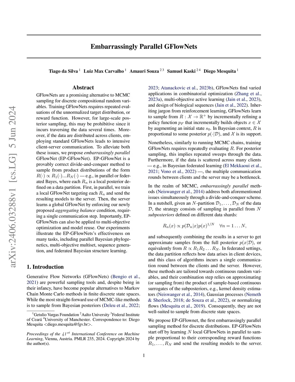 GFlowNets are a promising alternative to MCMC sampling for discrete compositional random variables. Training GFlowNets requires repeated evaluations of the unnormalized target distribution or reward function. However, for large-scale posterior sampling, this may be prohibitive since it incurs traversing the data several times. Moreover, if the data are distributed across clients, employing standard GFlowNets leads to intensive client-server communication. To alleviate both these issues, we propose embarrassingly parallel GFlowNet (EP-GFlowNet). EP-GFlowNet is a provably correct divide-and-conquer method to sample from product distributions of the form -- e.g., in parallel or federated Bayes, where each is a local posterior defined on a data partition. First, in parallel, we train a local GFlowNet targeting each and send the resulting models to the server. Then, the server learns a global GFlowNet by enforcing our newly proposed \emph{aggregating balance} condition, requiring a single communication step. Importantly, EP-GFlowNets can also be applied to multi-objective optimization and model reuse. Our experiments illustrate the EP-GFlowNets's effectiveness on many tasks, including parallel Bayesian phylogenetics, multi-objective multiset, sequence generation, and federated Bayesian structure learning.