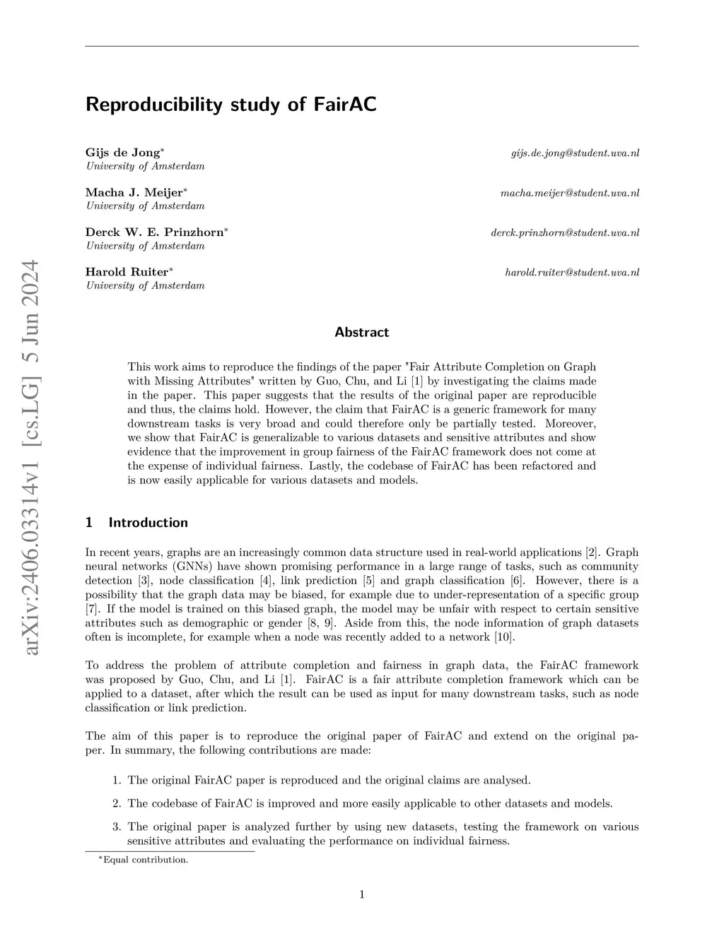This work aims to reproduce the findings of the paper "Fair Attribute Completion on Graph with Missing Attributes" written by Guo, Chu, and Li arXiv:2302.12977 by investigating the claims made in the paper. This paper suggests that the results of the original paper are reproducible and thus, the claims hold. However, the claim that FairAC is a generic framework for many downstream tasks is very broad and could therefore only be partially tested. Moreover, we show that FairAC is generalizable to various datasets and sensitive attributes and show evidence that the improvement in group fairness of the FairAC framework does not come at the expense of individual fairness. Lastly, the codebase of FairAC has been refactored and is now easily applicable for various datasets and models.
