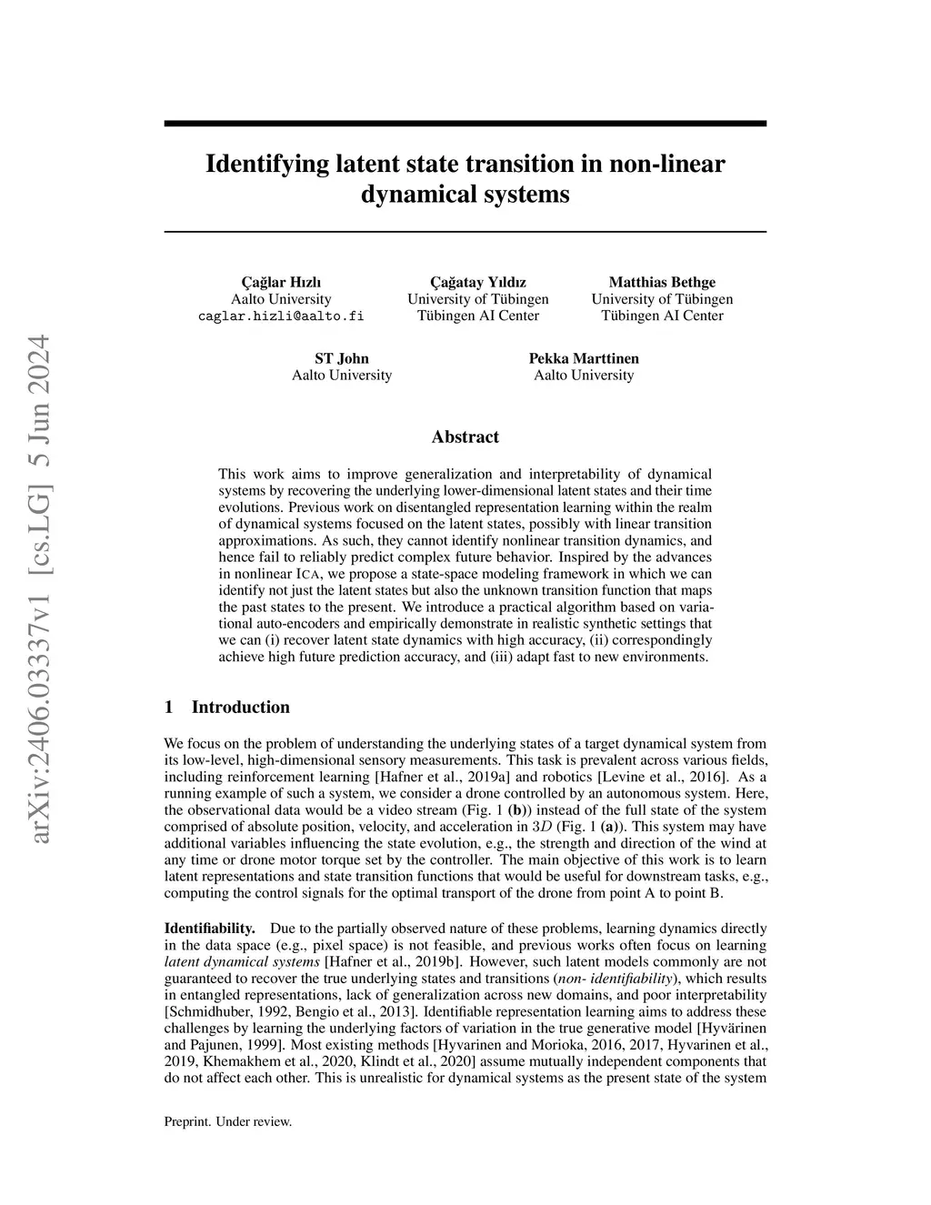 This work aims to improve generalization and interpretability of dynamical systems by recovering the underlying lower-dimensional latent states and their time evolutions. Previous work on disentangled representation learning within the realm of dynamical systems focused on the latent states, possibly with linear transition approximations. As such, they cannot identify nonlinear transition dynamics, and hence fail to reliably predict complex future behavior. Inspired by the advances in nonlinear ICA, we propose a state-space modeling framework in which we can identify not just the latent states but also the unknown transition function that maps the past states to the present. We introduce a practical algorithm based on variational auto-encoders and empirically demonstrate in realistic synthetic settings that we can (i) recover latent state dynamics with high accuracy, (ii) correspondingly achieve high future prediction accuracy, and (iii) adapt fast to new environments.