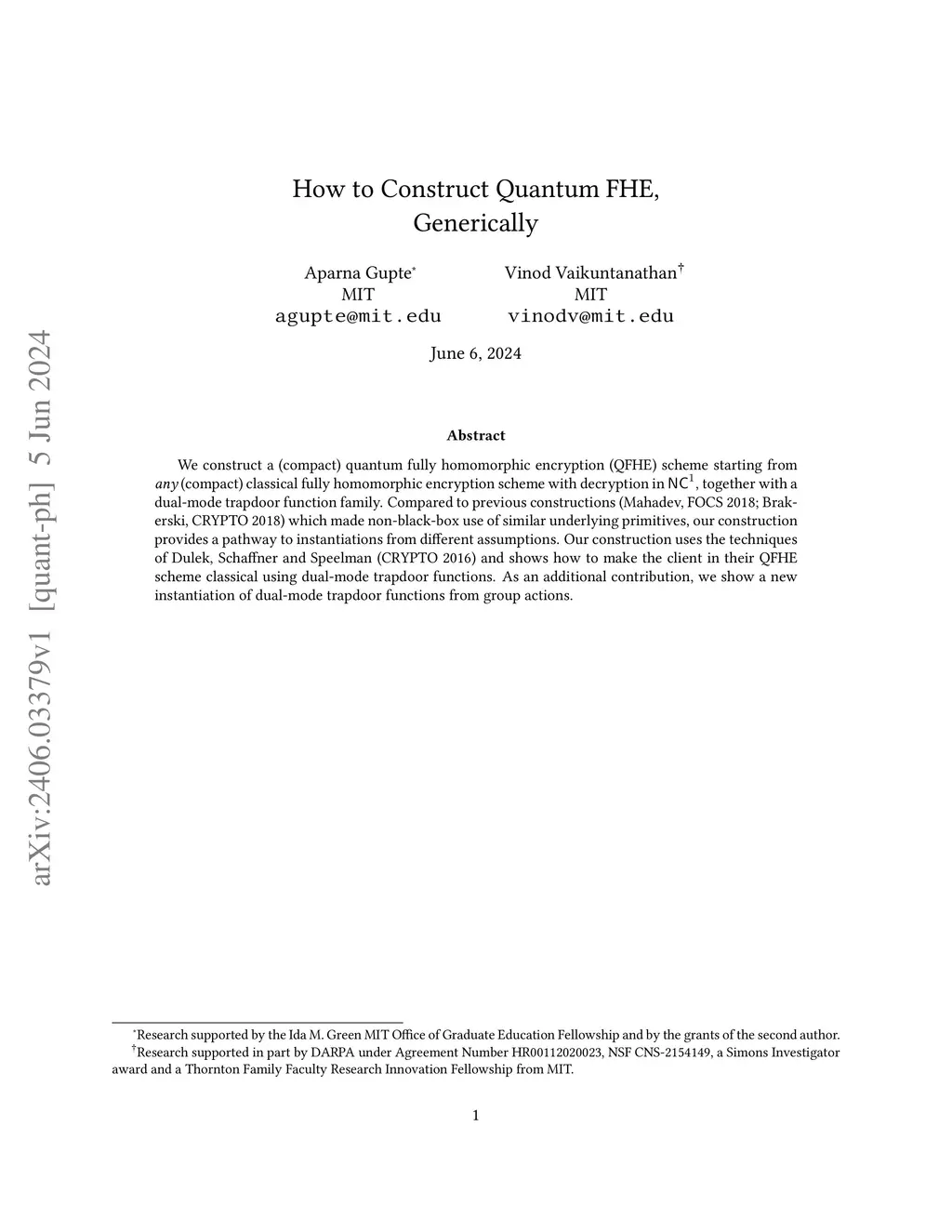 We construct a (compact) quantum fully homomorphic encryption (QFHE) scheme starting from (compact) classical fully homomorphic encryption scheme with decryption in , together with a dual-mode trapdoor function family. Compared to previous constructions (Mahadev, FOCS 2018; Brakerski, CRYPTO 2018) which made non-black-box use of similar underlying primitives, our construction provides a pathway to instantiations from different assumptions. Our construction uses the techniques of Dulek, Schaffner and Speelman (CRYPTO 2016) and shows how to make the client in their QFHE scheme classical using dual-mode trapdoor functions. As an additional contribution, we show a new instantiation of dual-mode trapdoor functions from group actions.