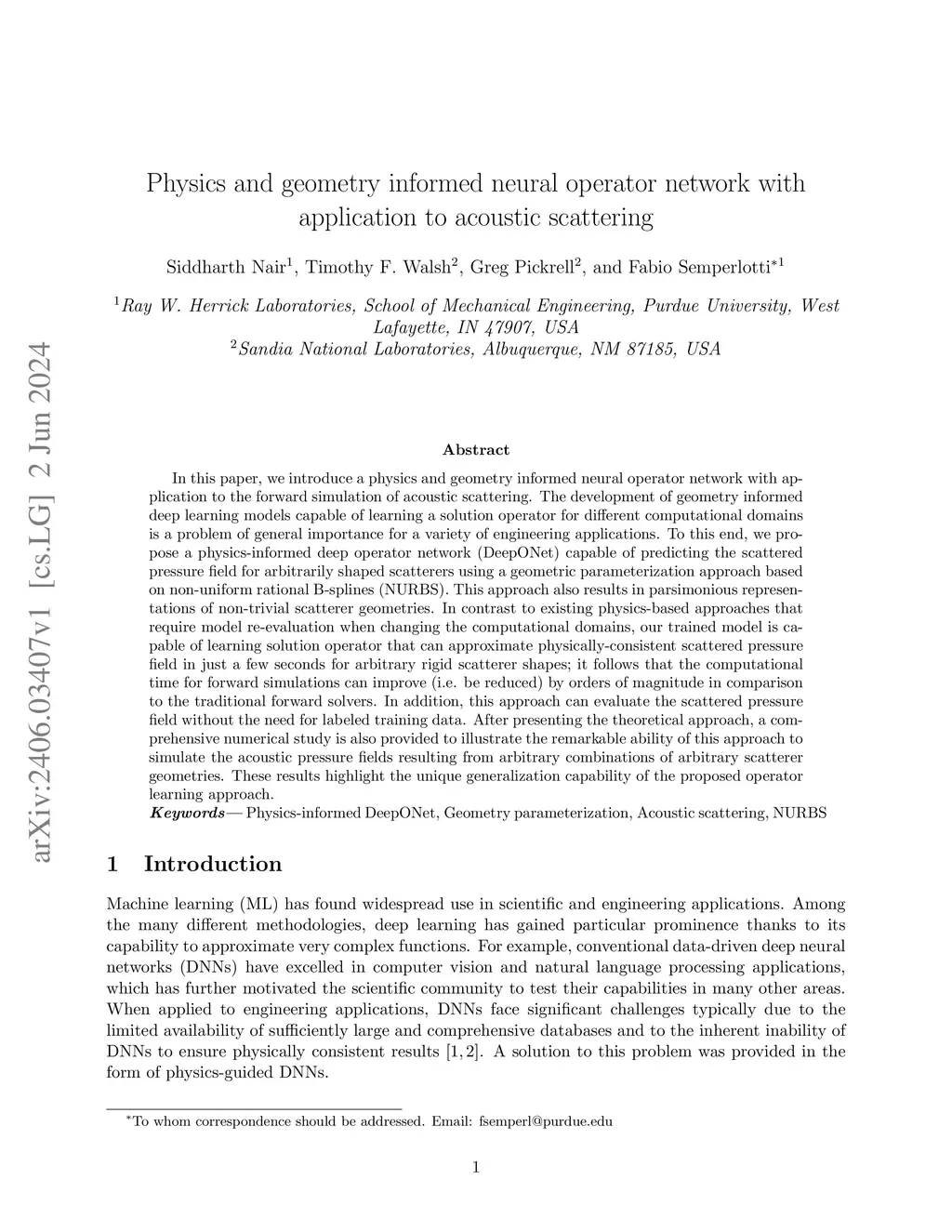 In this paper, we introduce a physics and geometry informed neural operator network with application to the forward simulation of acoustic scattering. The development of geometry informed deep learning models capable of learning a solution operator for different computational domains is a problem of general importance for a variety of engineering applications. To this end, we propose a physics-informed deep operator network (DeepONet) capable of predicting the scattered pressure field for arbitrarily shaped scatterers using a geometric parameterization approach based on non-uniform rational B-splines (NURBS). This approach also results in parsimonious representations of non-trivial scatterer geometries. In contrast to existing physics-based approaches that require model re-evaluation when changing the computational domains, our trained model is capable of learning solution operator that can approximate physically-consistent scattered pressure field in just a few seconds for arbitrary rigid scatterer shapes; it follows that the computational time for forward simulations can improve (i.e. be reduced) by orders of magnitude in comparison to the traditional forward solvers. In addition, this approach can evaluate the scattered pressure field without the need for labeled training data. After presenting the theoretical approach, a comprehensive numerical study is also provided to illustrate the remarkable ability of this approach to simulate the acoustic pressure fields resulting from arbitrary combinations of arbitrary scatterer geometries. These results highlight the unique generalization capability of the proposed operator learning approach.