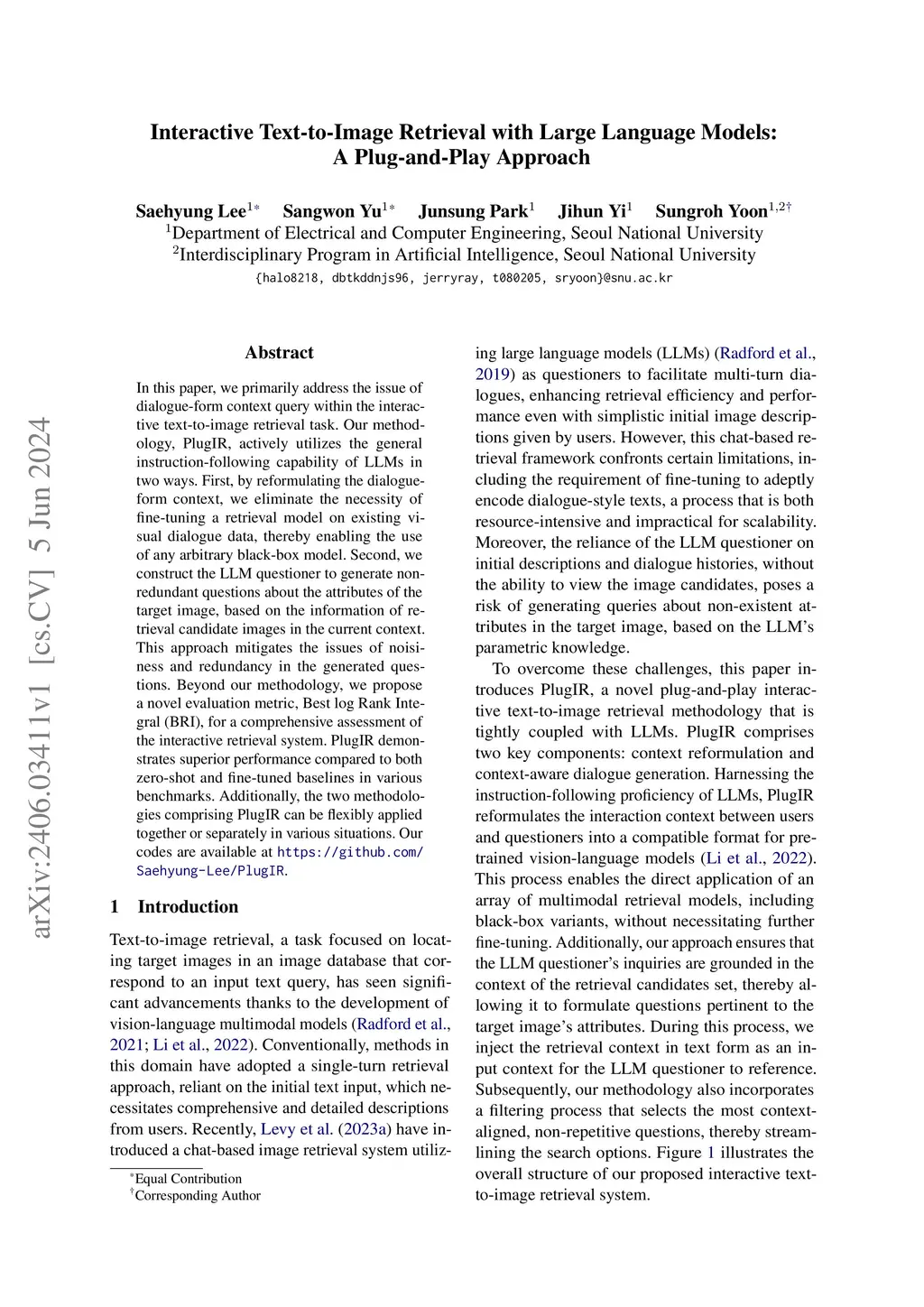 In this paper, we primarily address the issue of dialogue-form context query within the interactive text-to-image retrieval task. Our methodology, PlugIR, actively utilizes the general instruction-following capability of LLMs in two ways. First, by reformulating the dialogue-form context, we eliminate the necessity of fine-tuning a retrieval model on existing visual dialogue data, thereby enabling the use of any arbitrary black-box model. Second, we construct the LLM questioner to generate non-redundant questions about the attributes of the target image, based on the information of retrieval candidate images in the current context. This approach mitigates the issues of noisiness and redundancy in the generated questions. Beyond our methodology, we propose a novel evaluation metric, Best log Rank Integral (BRI), for a comprehensive assessment of the interactive retrieval system. PlugIR demonstrates superior performance compared to both zero-shot and fine-tuned baselines in various benchmarks. Additionally, the two methodologies comprising PlugIR can be flexibly applied together or separately in various situations. Our codes are available at https://github.com/Saehyung-Lee/PlugIR.