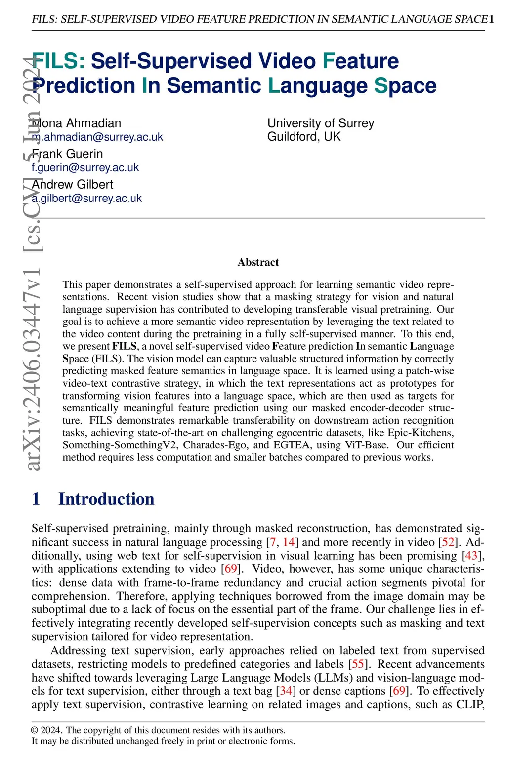 FILS: Self-Supervised Video Feature Prediction In Semantic Language