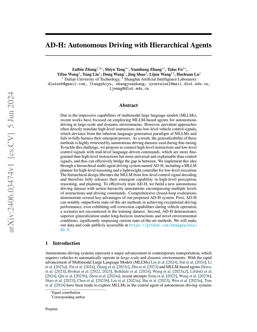 Due to the impressive capabilities of multimodal large language models (MLLMs), recent works have focused on employing MLLM-based agents for autonomous driving in large-scale and dynamic environments. However, prevalent approaches often directly translate high-level instructions into low-level vehicle control signals, which deviates from the inherent language generation paradigm of MLLMs and fails to fully harness their emergent powers. As a result, the generalizability of these methods is highly restricted by autonomous driving datasets used during fine-tuning. To tackle this challenge, we propose to connect high-level instructions and low-level control signals with mid-level language-driven commands, which are more fine-grained than high-level instructions but more universal and explainable than control signals, and thus can effectively bridge the gap in between. We implement this idea through a hierarchical multi-agent driving system named AD-H, including a MLLM planner for high-level reasoning and a lightweight controller for low-level execution. The hierarchical design liberates the MLLM from low-level control signal decoding and therefore fully releases their emergent capability in high-level perception, reasoning, and planning. We build a new dataset with action hierarchy annotations. Comprehensive closed-loop evaluations demonstrate several key advantages of our proposed AD-H system. First, AD-H can notably outperform state-of-the-art methods in achieving exceptional driving performance, even exhibiting self-correction capabilities during vehicle operation, a scenario not encountered in the training dataset. Second, AD-H demonstrates superior generalization under long-horizon instructions and novel environmental conditions, significantly surpassing current state-of-the-art methods. We will make our data and code publicly accessible at https://github.com/zhangzaibin/AD-H
