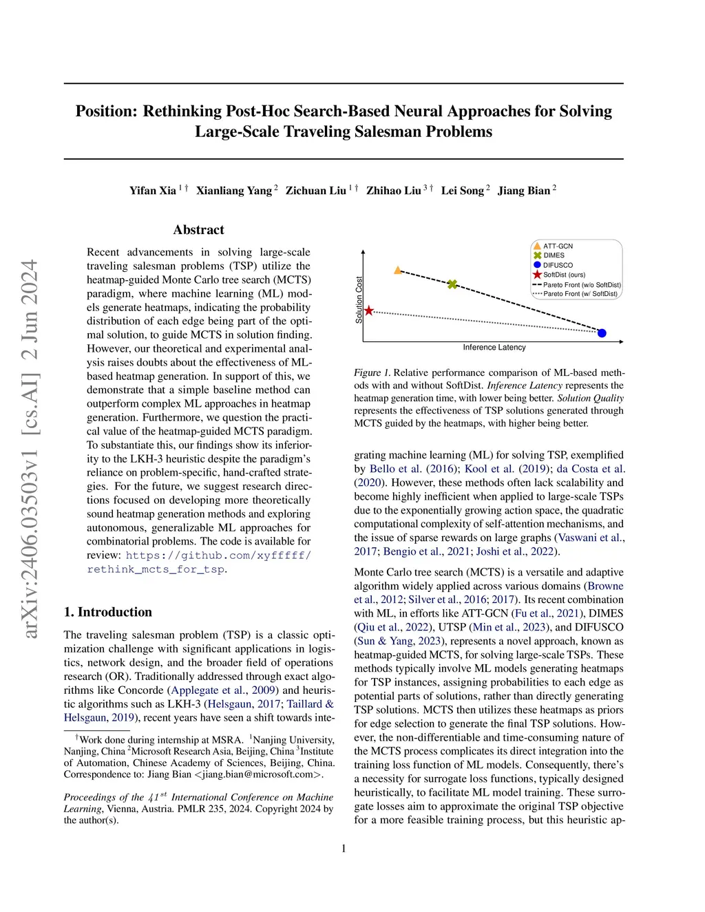 Recent advancements in solving large-scale traveling salesman problems (TSP) utilize the heatmap-guided Monte Carlo tree search (MCTS) paradigm, where machine learning (ML) models generate heatmaps, indicating the probability distribution of each edge being part of the optimal solution, to guide MCTS in solution finding. However, our theoretical and experimental analysis raises doubts about the effectiveness of ML-based heatmap generation. In support of this, we demonstrate that a simple baseline method can outperform complex ML approaches in heatmap generation. Furthermore, we question the practical value of the heatmap-guided MCTS paradigm. To substantiate this, our findings show its inferiority to the LKH-3 heuristic despite the paradigm's reliance on problem-specific, hand-crafted strategies. For the future, we suggest research directions focused on developing more theoretically sound heatmap generation methods and exploring autonomous, generalizable ML approaches for combinatorial problems. The code is available for review: https://github.com/xyfffff/rethink_mcts_for_tsp.