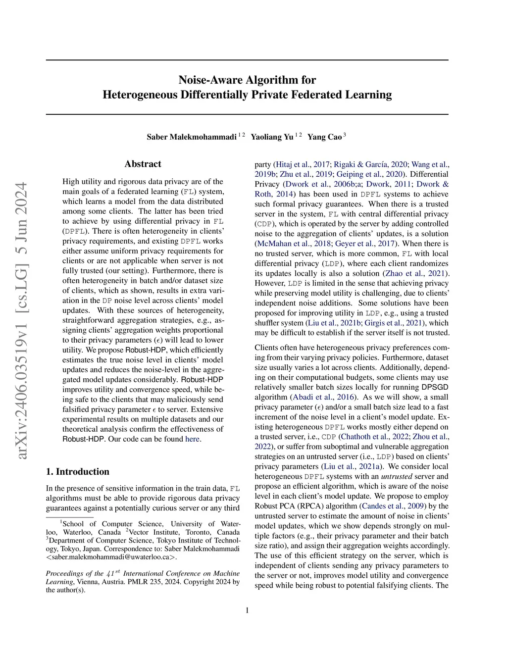 High utility and rigorous data privacy are of the main goals of a federated learning (FL) system, which learns a model from the data distributed among some clients. The latter has been tried to achieve by using differential privacy in FL (DPFL). There is often heterogeneity in clients privacy requirements, and existing DPFL works either assume uniform privacy requirements for clients or are not applicable when server is not fully trusted (our setting). Furthermore, there is often heterogeneity in batch and/or dataset size of clients, which as shown, results in extra variation in the DP noise level across clients model updates. With these sources of heterogeneity, straightforward aggregation strategies, e.g., assigning clients aggregation weights proportional to their privacy parameters will lead to lower utility. We propose Robust-HDP, which efficiently estimates the true noise level in clients model updates and reduces the noise-level in the aggregated model updates considerably. Robust-HDP improves utility and convergence speed, while being safe to the clients that may maliciously send falsified privacy parameter to server. Extensive experimental results on multiple datasets and our theoretical analysis confirm the effectiveness of Robust-HDP. Our code can be found here.