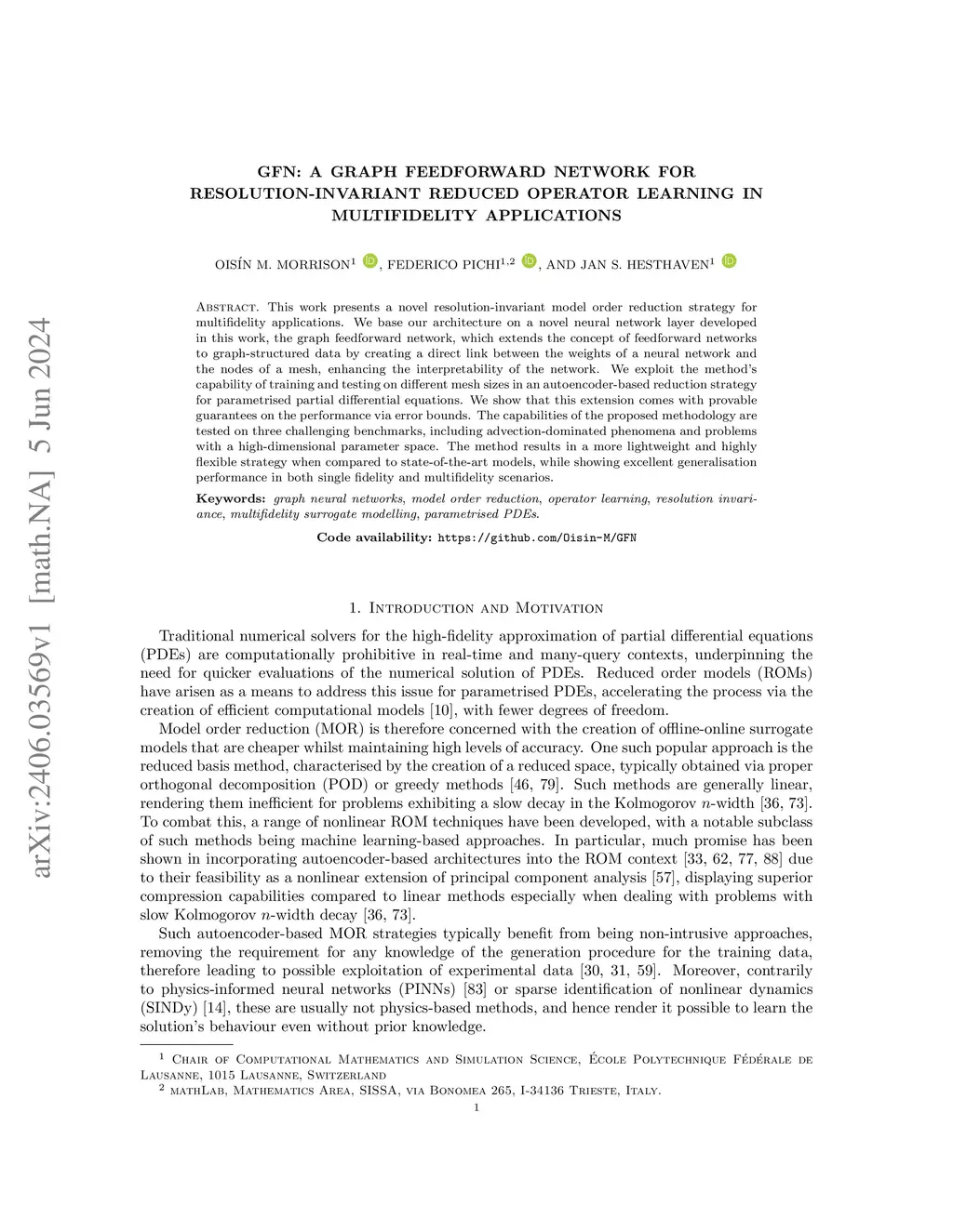 This work presents a novel resolution-invariant model order reduction strategy for multifidelity applications. We base our architecture on a novel neural network layer developed in this work, the graph feedforward network, which extends the concept of feedforward networks to graph-structured data by creating a direct link between the weights of a neural network and the nodes of a mesh, enhancing the interpretability of the network. We exploit the method's capability of training and testing on different mesh sizes in an autoencoder-based reduction strategy for parametrised partial differential equations. We show that this extension comes with provable guarantees on the performance via error bounds. The capabilities of the proposed methodology are tested on three challenging benchmarks, including advection-dominated phenomena and problems with a high-dimensional parameter space. The method results in a more lightweight and highly flexible strategy when compared to state-of-the-art models, while showing excellent generalisation performance in both single fidelity and multifidelity scenarios.