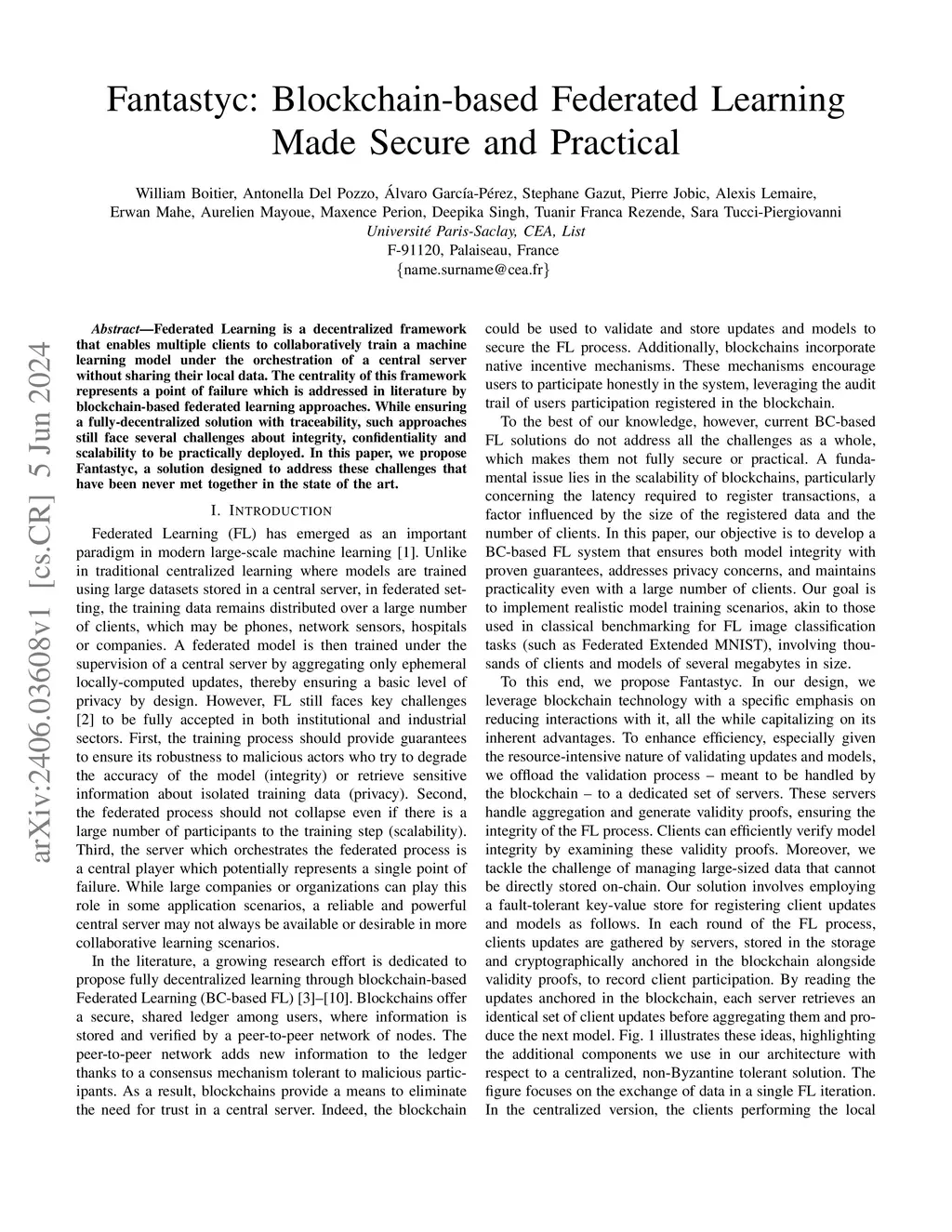 Federated Learning is a decentralized framework that enables multiple clients to collaboratively train a machine learning model under the orchestration of a central server without sharing their local data. The centrality of this framework represents a point of failure which is addressed in literature by blockchain-based federated learning approaches. While ensuring a fully-decentralized solution with traceability, such approaches still face several challenges about integrity, confidentiality and scalability to be practically deployed. In this paper, we propose Fantastyc, a solution designed to address these challenges that have been never met together in the state of the art.