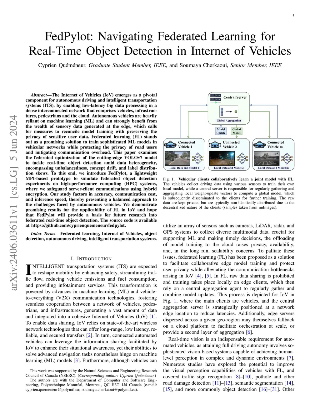 The Internet of Vehicles (IoV) emerges as a pivotal component for autonomous driving and intelligent transportation systems (ITS), by enabling low-latency big data processing in a dense interconnected network that comprises vehicles, infrastructures, pedestrians and the cloud. Autonomous vehicles are heavily reliant on machine learning (ML) and can strongly benefit from the wealth of sensory data generated at the edge, which calls for measures to reconcile model training with preserving the privacy of sensitive user data. Federated learning (FL) stands out as a promising solution to train sophisticated ML models in vehicular networks while protecting the privacy of road users and mitigating communication overhead. This paper examines the federated optimization of the cutting-edge YOLOv7 model to tackle real-time object detection amid data heterogeneity, encompassing unbalancedness, concept drift, and label distribution skews. To this end, we introduce FedPylot, a lightweight MPI-based prototype to simulate federated object detection experiments on high-performance computing (HPC) systems, where we safeguard server-client communications using hybrid encryption. Our study factors in accuracy, communication cost, and inference speed, thereby presenting a balanced approach to the challenges faced by autonomous vehicles. We demonstrate promising results for the applicability of FL in IoV and hope that FedPylot will provide a basis for future research into federated real-time object detection. The source code is available at https://github.com/cyprienquemeneur/fedpylot.