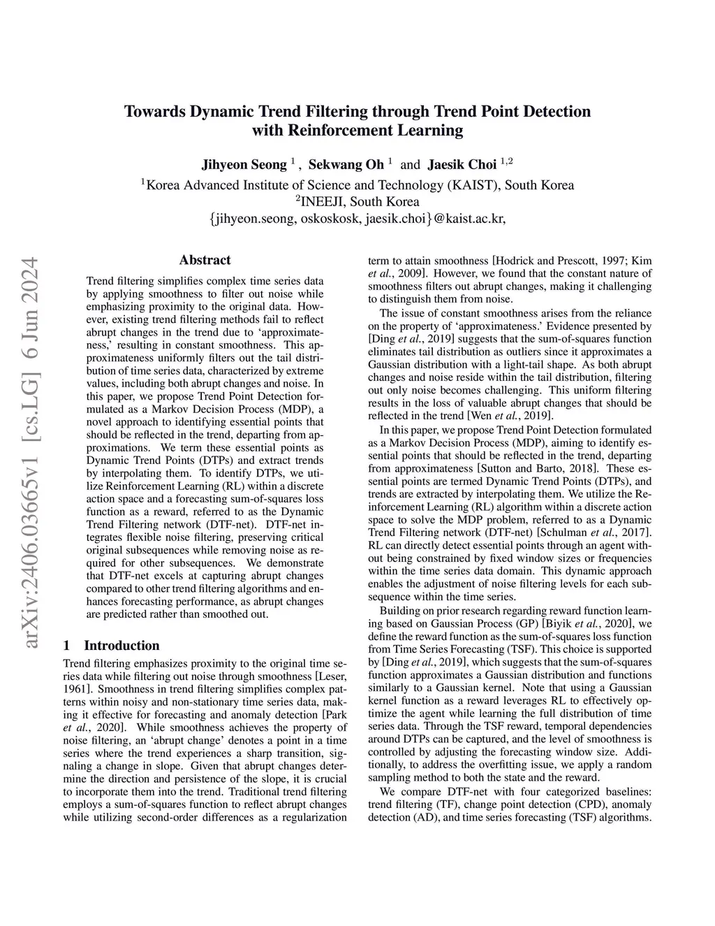 Towards Dynamic Trend Filtering through Trend Point Detection with Reinforcement Learning