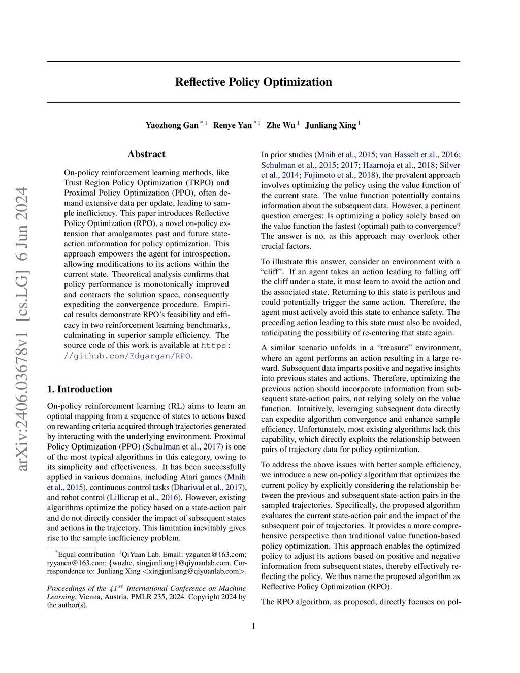 On-policy reinforcement learning methods, like Trust Region Policy Optimization (TRPO) and Proximal Policy Optimization (PPO), often demand extensive data per update, leading to sample inefficiency. This paper introduces Reflective Policy Optimization (RPO), a novel on-policy extension that amalgamates past and future state-action information for policy optimization. This approach empowers the agent for introspection, allowing modifications to its actions within the current state. Theoretical analysis confirms that policy performance is monotonically improved and contracts the solution space, consequently expediting the convergence procedure. Empirical results demonstrate RPO's feasibility and efficacy in two reinforcement learning benchmarks, culminating in superior sample efficiency. The source code of this work is available at https://github.com/Edgargan/RPO.