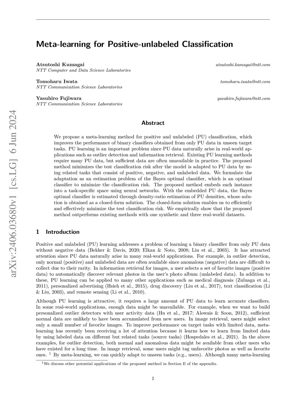 We propose a meta-learning method for positive and unlabeled (PU) classification, which improves the performance of binary classifiers obtained from only PU data in unseen target tasks. PU learning is an important problem since PU data naturally arise in real-world applications such as outlier detection and information retrieval. Existing PU learning methods require many PU data, but sufficient data are often unavailable in practice. The proposed method minimizes the test classification risk after the model is adapted to PU data by using related tasks that consist of positive, negative, and unlabeled data. We formulate the adaptation as an estimation problem of the Bayes optimal classifier, which is an optimal classifier to minimize the classification risk. The proposed method embeds each instance into a task-specific space using neural networks. With the embedded PU data, the Bayes optimal classifier is estimated through density-ratio estimation of PU densities, whose solution is obtained as a closed-form solution. The closed-form solution enables us to efficiently and effectively minimize the test classification risk. We empirically show that the proposed method outperforms existing methods with one synthetic and three real-world datasets.