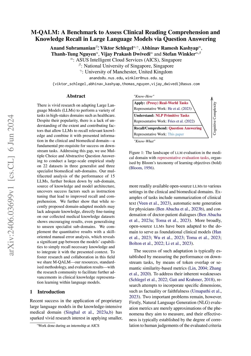 There is vivid research on adapting Large Language Models (LLMs) to perform a variety of tasks in high-stakes domains such as healthcare. Despite their popularity, there is a lack of understanding of the extent and contributing factors that allow LLMs to recall relevant knowledge and combine it with presented information in the clinical and biomedical domain: a fundamental pre-requisite for success on down-stream tasks. Addressing this gap, we use Multiple Choice and Abstractive Question Answering to conduct a large-scale empirical study on 22 datasets in three generalist and three specialist biomedical sub-domains. Our multifaceted analysis of the performance of 15 LLMs, further broken down by sub-domain, source of knowledge and model architecture, uncovers success factors such as instruction tuning that lead to improved recall and comprehension. We further show that while recently proposed domain-adapted models may lack adequate knowledge, directly fine-tuning on our collected medical knowledge datasets shows encouraging results, even generalising to unseen specialist sub-domains. We complement the quantitative results with a skill-oriented manual error analysis, which reveals a significant gap between the models' capabilities to simply recall necessary knowledge and to integrate it with the presented context. To foster research and collaboration in this field we share M-QALM, our resources, standardised methodology, and evaluation results, with the research community to facilitate further advancements in clinical knowledge representation learning within language models.