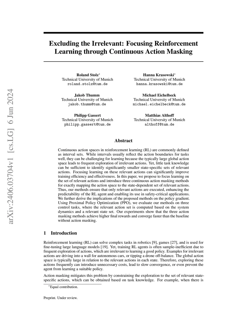 Continuous action spaces in reinforcement learning (RL) are commonly defined as interval sets. While intervals usually reflect the action boundaries for tasks well, they can be challenging for learning because the typically large global action space leads to frequent exploration of irrelevant actions. Yet, little task knowledge can be sufficient to identify significantly smaller state-specific sets of relevant actions. Focusing learning on these relevant actions can significantly improve training efficiency and effectiveness. In this paper, we propose to focus learning on the set of relevant actions and introduce three continuous action masking methods for exactly mapping the action space to the state-dependent set of relevant actions. Thus, our methods ensure that only relevant actions are executed, enhancing the predictability of the RL agent and enabling its use in safety-critical applications. We further derive the implications of the proposed methods on the policy gradient. Using Proximal Policy Optimization (PPO), we evaluate our methods on three control tasks, where the relevant action set is computed based on the system dynamics and a relevant state set. Our experiments show that the three action masking methods achieve higher final rewards and converge faster than the baseline without action masking.