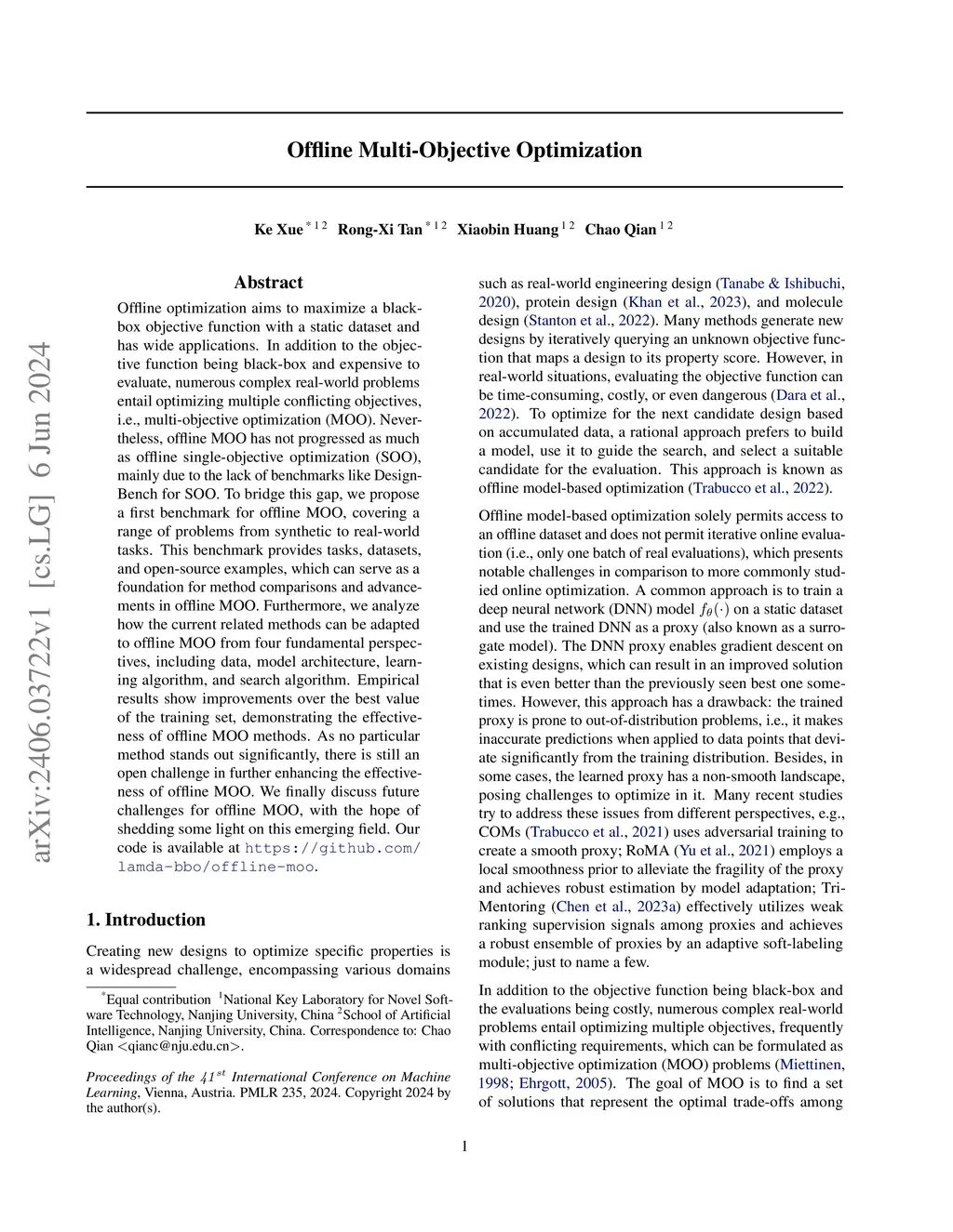 Offline optimization aims to maximize a black-box objective function with a static dataset and has wide applications. In addition to the objective function being black-box and expensive to evaluate, numerous complex real-world problems entail optimizing multiple conflicting objectives, i.e., multi-objective optimization (MOO). Nevertheless, offline MOO has not progressed as much as offline single-objective optimization (SOO), mainly due to the lack of benchmarks like Design-Bench for SOO. To bridge this gap, we propose a first benchmark for offline MOO, covering a range of problems from synthetic to real-world tasks. This benchmark provides tasks, datasets, and open-source examples, which can serve as a foundation for method comparisons and advancements in offline MOO. Furthermore, we analyze how the current related methods can be adapted to offline MOO from four fundamental perspectives, including data, model architecture, learning algorithm, and search algorithm. Empirical results show improvements over the best value of the training set, demonstrating the effectiveness of offline MOO methods. As no particular method stands out significantly, there is still an open challenge in further enhancing the effectiveness of offline MOO. We finally discuss future challenges for offline MOO, with the hope of shedding some light on this emerging field. Our code is available at \url{https://github.com/lamda-bbo/offline-moo}.