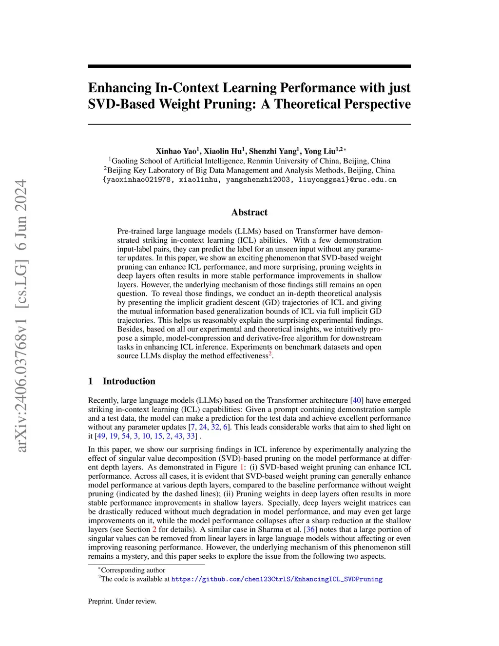 Pre-trained large language models (LLMs) based on Transformer have demonstrated striking in-context learning (ICL) abilities. With a few demonstration input-label pairs, they can predict the label for an unseen input without any parameter updates. In this paper, we show an exciting phenomenon that SVD-based weight pruning can enhance ICL performance, and more surprising, pruning weights in deep layers often results in more stable performance improvements in shallow layers. However, the underlying mechanism of those findings still remains an open question. To reveal those findings, we conduct an in-depth theoretical analysis by presenting the implicit gradient descent (GD) trajectories of ICL and giving the mutual information based generalization bounds of ICL via full implicit GD trajectories. This helps us reasonably explain the surprising experimental findings. Besides, based on all our experimental and theoretical insights, we intuitively propose a simple, model-compression and derivative-free algorithm for downstream tasks in enhancing ICL inference. Experiments on benchmark datasets and open source LLMs display the method effectiveness\footnote{The code is available at \url{https://github.com/chen123CtrlS/EnhancingICL_SVDPruning}}.