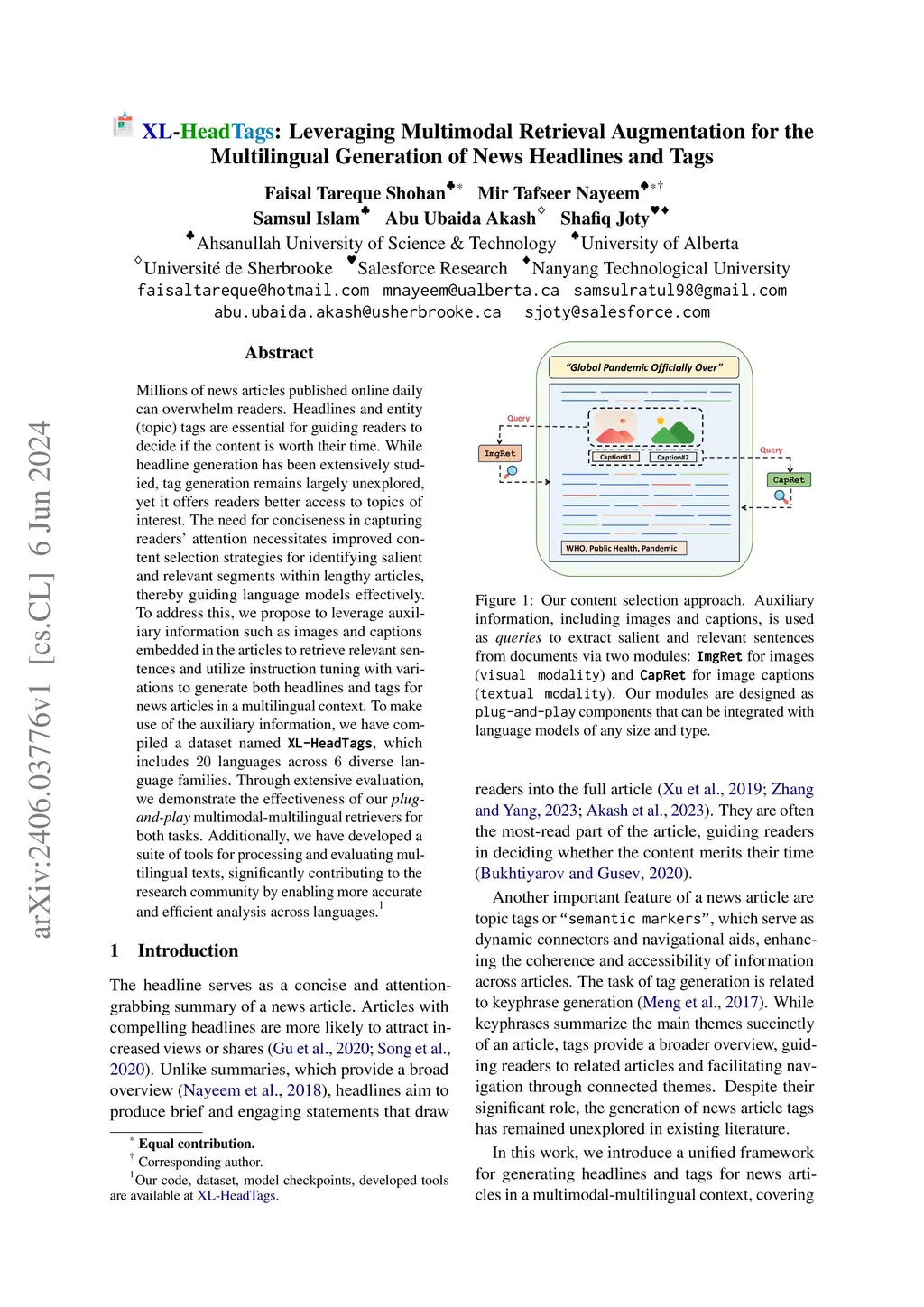 Millions of news articles published online daily can overwhelm readers. Headlines and entity (topic) tags are essential for guiding readers to decide if the content is worth their time. While headline generation has been extensively studied, tag generation remains largely unexplored, yet it offers readers better access to topics of interest. The need for conciseness in capturing readers' attention necessitates improved content selection strategies for identifying salient and relevant segments within lengthy articles, thereby guiding language models effectively. To address this, we propose to leverage auxiliary information such as images and captions embedded in the articles to retrieve relevant sentences and utilize instruction tuning with variations to generate both headlines and tags for news articles in a multilingual context. To make use of the auxiliary information, we have compiled a dataset named XL-HeadTags, which includes 20 languages across 6 diverse language families. Through extensive evaluation, we demonstrate the effectiveness of our plug-and-play multimodal-multilingual retrievers for both tasks. Additionally, we have developed a suite of tools for processing and evaluating multilingual texts, significantly contributing to the research community by enabling more accurate and efficient analysis across languages.