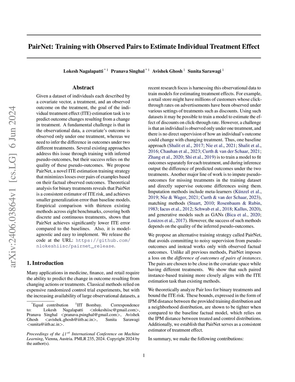 Given a dataset of individuals each described by a covariate vector, a treatment, and an observed outcome on the treatment, the goal of the individual treatment effect (ITE) estimation task is to predict outcome changes resulting from a change in treatment. A fundamental challenge is that in the observational data, a covariate's outcome is observed only under one treatment, whereas we need to infer the difference in outcomes under two different treatments. Several existing approaches address this issue through training with inferred pseudo-outcomes, but their success relies on the quality of these pseudo-outcomes. We propose PairNet, a novel ITE estimation training strategy that minimizes losses over pairs of examples based on their factual observed outcomes. Theoretical analysis for binary treatments reveals that PairNet is a consistent estimator of ITE risk, and achieves smaller generalization error than baseline models. Empirical comparison with thirteen existing methods across eight benchmarks, covering both discrete and continuous treatments, shows that PairNet achieves significantly lower ITE error compared to the baselines. Also, it is model-agnostic and easy to implement.