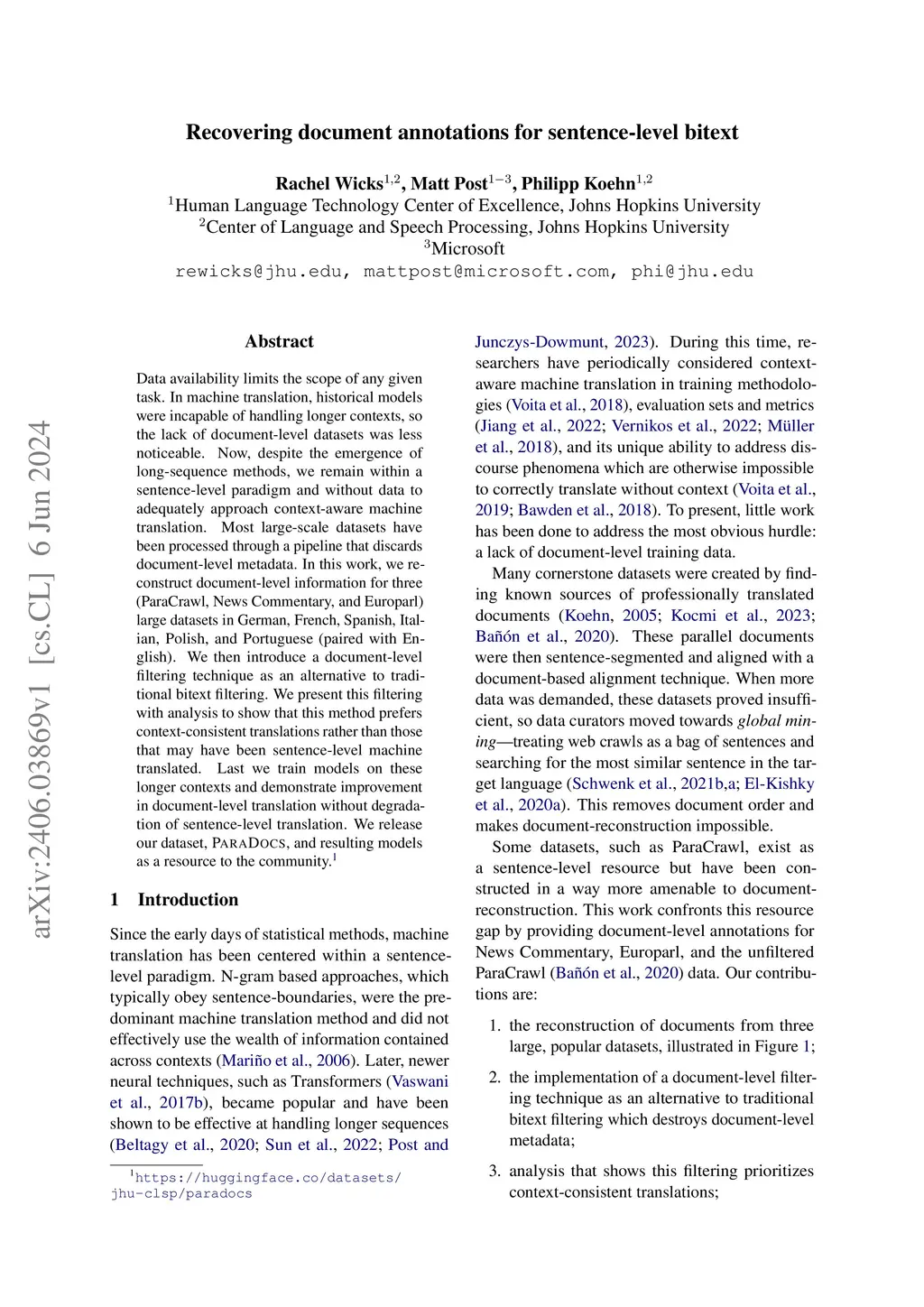 Data availability limits the scope of any given task. In machine translation, historical models were incapable of handling longer contexts, so the lack of document-level datasets was less noticeable. Now, despite the emergence of long-sequence methods, we remain within a sentence-level paradigm and without data to adequately approach context-aware machine translation. Most large-scale datasets have been processed through a pipeline that discards document-level metadata. In this work, we reconstruct document-level information for three (ParaCrawl, News Commentary, and Europarl) large datasets in German, French, Spanish, Italian, Polish, and Portuguese (paired with English). We then introduce a document-level filtering technique as an alternative to traditional bitext filtering. We present this filtering with analysis to show that this method prefers context-consistent translations rather than those that may have been sentence-level machine translated. Last we train models on these longer contexts and demonstrate improvement in document-level translation without degradation of sentence-level translation. We release our dataset, ParaDocs, and resulting models as a resource to the community.
