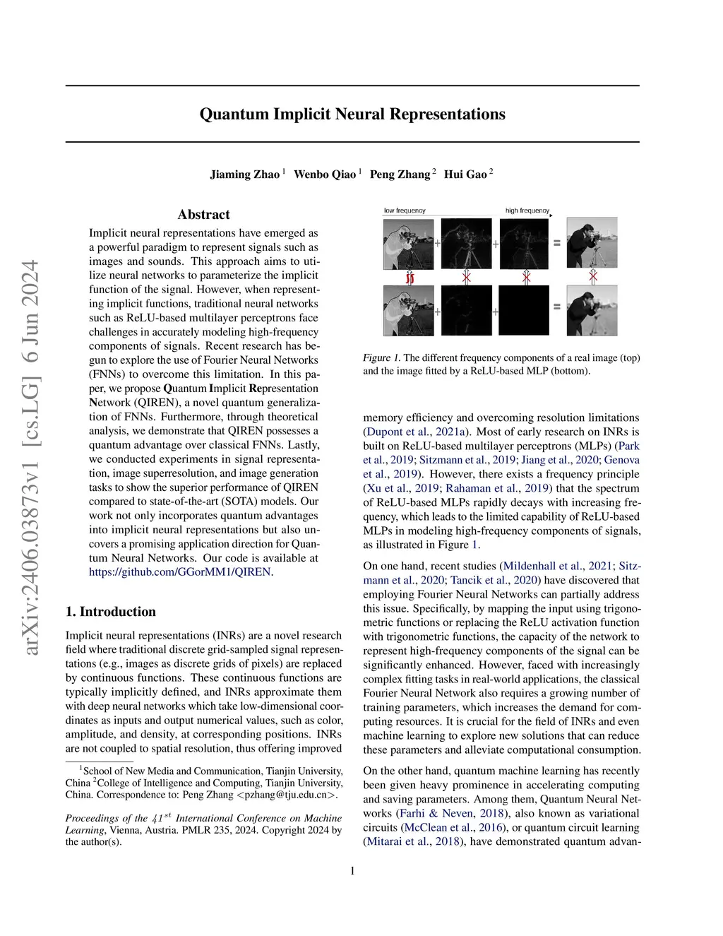 Implicit neural representations have emerged as a powerful paradigm to represent signals such as images and sounds. This approach aims to utilize neural networks to parameterize the implicit function of the signal. However, when representing implicit functions, traditional neural networks such as ReLU-based multilayer perceptrons face challenges in accurately modeling high-frequency components of signals. Recent research has begun to explore the use of Fourier Neural Networks (FNNs) to overcome this limitation. In this paper, we propose Quantum Implicit Representation Network (QIREN), a novel quantum generalization of FNNs. Furthermore, through theoretical analysis, we demonstrate that QIREN possesses a quantum advantage over classical FNNs. Lastly, we conducted experiments in signal representation, image superresolution, and image generation tasks to show the superior performance of QIREN compared to state-of-the-art (SOTA) models. Our work not only incorporates quantum advantages into implicit neural representations but also uncovers a promising application direction for Quantum Neural Networks.