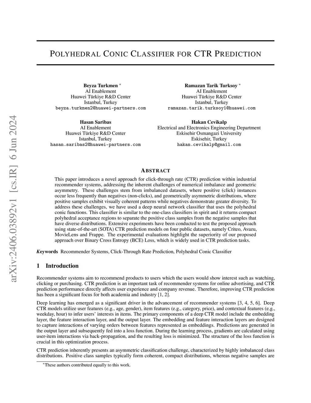 This paper introduces a novel approach for click-through rate (CTR) prediction within industrial recommender systems, addressing the inherent challenges of numerical imbalance and geometric asymmetry. These challenges stem from imbalanced datasets, where positive (click) instances occur less frequently than negatives (non-clicks), and geometrically asymmetric distributions, where positive samples exhibit visually coherent patterns while negatives demonstrate greater diversity. To address these challenges, we have used a deep neural network classifier that uses the polyhedral conic functions. This classifier is similar to the one-class classifiers in spirit and it returns compact polyhedral acceptance regions to separate the positive class samples from the negative samples that have diverse distributions. Extensive experiments have been conducted to test the proposed approach using state-of-the-art (SOTA) CTR prediction models on four public datasets, namely Criteo, Avazu, MovieLens and Frappe. The experimental evaluations highlight the superiority of our proposed approach over Binary Cross Entropy (BCE) Loss, which is widely used in CTR prediction tasks.