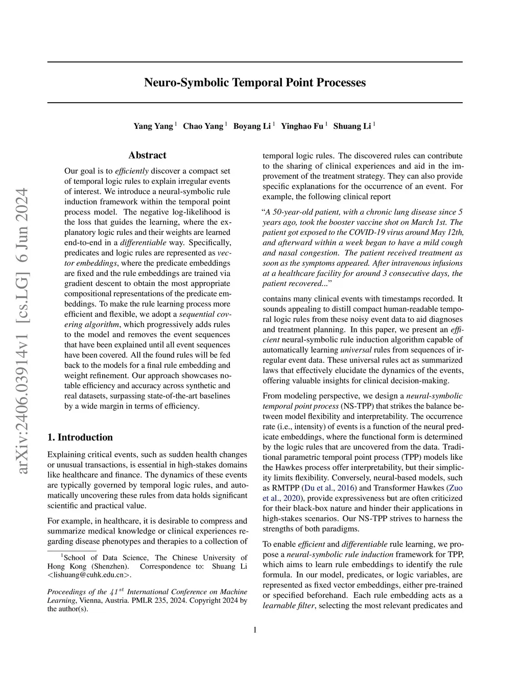 Our goal is to discover a compact set of temporal logic rules to explain irregular events of interest. We introduce a neural-symbolic rule induction framework within the temporal point process model. The negative log-likelihood is the loss that guides the learning, where the explanatory logic rules and their weights are learned end-to-end in a way. Specifically, predicates and logic rules are represented as , where the predicate embeddings are fixed and the rule embeddings are trained via gradient descent to obtain the most appropriate compositional representations of the predicate embeddings. To make the rule learning process more efficient and flexible, we adopt a , which progressively adds rules to the model and removes the event sequences that have been explained until all event sequences have been covered. All the found rules will be fed back to the models for a final rule embedding and weight refinement. Our approach showcases notable efficiency and accuracy across synthetic and real datasets, surpassing state-of-the-art baselines by a wide margin in terms of efficiency.