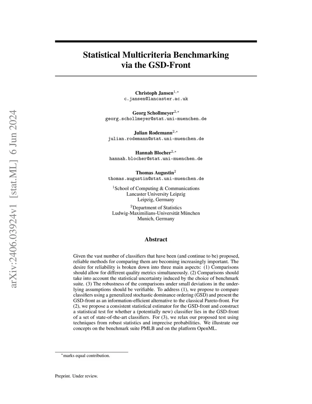 Given the vast number of classifiers that have been (and continue to be) proposed, reliable methods for comparing them are becoming increasingly important. The desire for reliability is broken down into three main aspects: (1) Comparisons should allow for different quality metrics simultaneously. (2) Comparisons should take into account the statistical uncertainty induced by the choice of benchmark suite. (3) The robustness of the comparisons under small deviations in the underlying assumptions should be verifiable. To address (1), we propose to compare classifiers using a generalized stochastic dominance ordering (GSD) and present the GSD-front as an information-efficient alternative to the classical Pareto-front. For (2), we propose a consistent statistical estimator for the GSD-front and construct a statistical test for whether a (potentially new) classifier lies in the GSD-front of a set of state-of-the-art classifiers. For (3), we relax our proposed test using techniques from robust statistics and imprecise probabilities. We illustrate our concepts on the benchmark suite PMLB and on the platform OpenML.