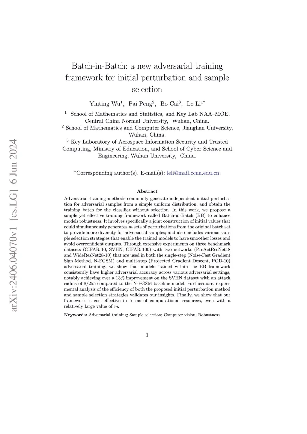 Adversarial training methods commonly generate independent initial perturbation for adversarial samples from a simple uniform distribution, and obtain the training batch for the classifier without selection. In this work, we propose a simple yet effective training framework called Batch-in-Batch (BB) to enhance models robustness. It involves specifically a joint construction of initial values that could simultaneously generates sets of perturbations from the original batch set to provide more diversity for adversarial samples; and also includes various sample selection strategies that enable the trained models to have smoother losses and avoid overconfident outputs. Through extensive experiments on three benchmark datasets (CIFAR-10, SVHN, CIFAR-100) with two networks (PreActResNet18 and WideResNet28-10) that are used in both the single-step (Noise-Fast Gradient Sign Method, N-FGSM) and multi-step (Projected Gradient Descent, PGD-10) adversarial training, we show that models trained within the BB framework consistently have higher adversarial accuracy across various adversarial settings, notably achieving over a 13% improvement on the SVHN dataset with an attack radius of 8/255 compared to the N-FGSM baseline model. Furthermore, experimental analysis of the efficiency of both the proposed initial perturbation method and sample selection strategies validates our insights. Finally, we show that our framework is cost-effective in terms of computational resources, even with a relatively large value of .