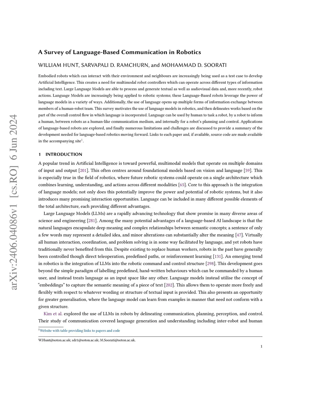 Embodied robots which can interact with their environment and neighbours are increasingly being used as a test case to develop Artificial Intelligence. This creates a need for multimodal robot controllers that can operate across different types of information, including text. Large Language Models are able to process and generate textual as well as audiovisual data and, more recently, robot actions. Language Models are increasingly being applied to robotic systems; these Language-Based robots leverage the power of language models in a variety of ways. Additionally, the use of language opens up multiple forms of information exchange between members of a human-robot team. This survey motivates the use of language models in robotics, and then delineates works based on the part of the overall control flow in which language is incorporated. Language can be used by human to task a robot, by a robot to inform a human, between robots as a human-like communication medium, and internally for a robot's planning and control. Applications of language-based robots are explored, and numerous limitations and challenges are discussed to provide a summary of the development needed for the future of language-based robotics.