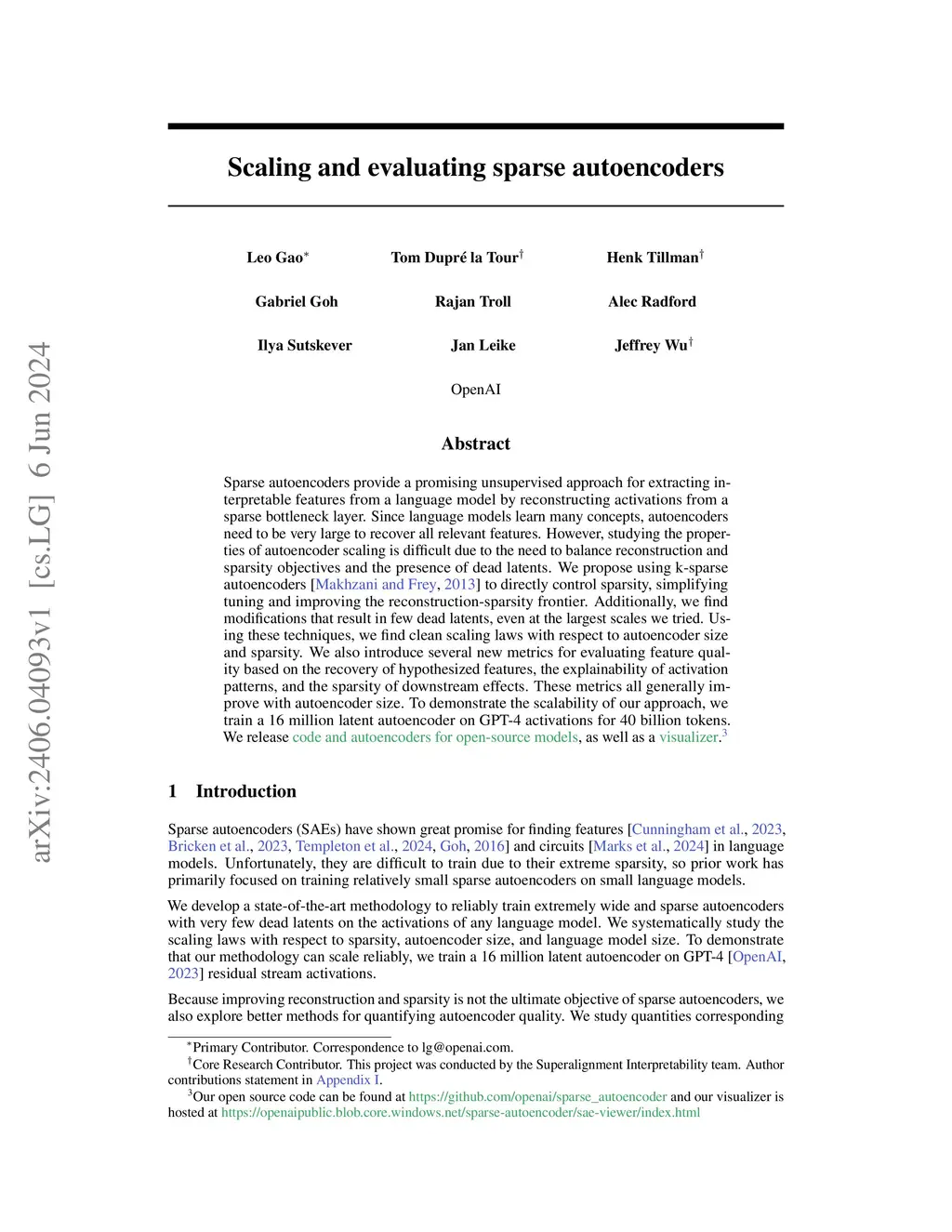Sparse autoencoders provide a promising unsupervised approach for extracting interpretable features from a language model by reconstructing activations from a sparse bottleneck layer. Since language models learn many concepts, autoencoders need to be very large to recover all relevant features. However, studying the properties of autoencoder scaling is difficult due to the need to balance reconstruction and sparsity objectives and the presence of dead latents. We propose using k-sparse autoencoders [Makhzani and Frey, 2013] to directly control sparsity, simplifying tuning and improving the reconstruction-sparsity frontier. Additionally, we find modifications that result in few dead latents, even at the largest scales we tried. Using these techniques, we find clean scaling laws with respect to autoencoder size and sparsity. We also introduce several new metrics for evaluating feature quality based on the recovery of hypothesized features, the explainability of activation patterns, and the sparsity of downstream effects. These metrics all generally improve with autoencoder size. To demonstrate the scalability of our approach, we train a 16 million latent autoencoder on GPT-4 activations for 40 billion tokens. We release training code and autoencoders for open-source models, as well as a visualizer.