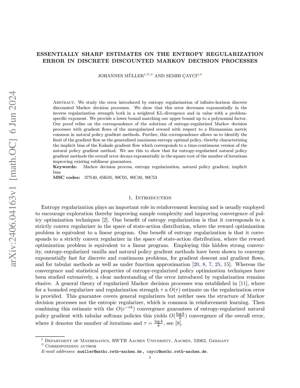 We study the error introduced by entropy regularization in infinite-horizon, discrete, discounted Markov decision processes. We show that this error decreases exponentially in the inverse regularization strength both in a weighted KL-divergence and in value with a problem-specific exponent. This is in contrast to previously known estimates, of the order , where is the regularization strength. We provide a lower bound matching our upper bound up to a polynomial term, thereby characterizing the exponential convergence rate for entropy regularization. Our proof relies on the observation that the solutions of entropy-regularized Markov decision processes solve a gradient flow of the unregularized reward with respect to a Riemannian metric common in natural policy gradient methods. This correspondence allows us to identify the limit of this gradient flow as the generalized maximum entropy optimal policy, thereby characterizing the implicit bias of this gradient flow, which corresponds to a time-continuous version of the natural policy gradient method. We use our improved error estimates to show that for entropy-regularized natural policy gradient methods, the overall error decays exponentially in the square root of the number of iterations, improving over existing sublinear guarantees. Finally, we extend our analysis to settings beyond the entropy. In particular, we characterize the implicit bias regarding general convex potentials and their resulting generalized natural policy gradients.