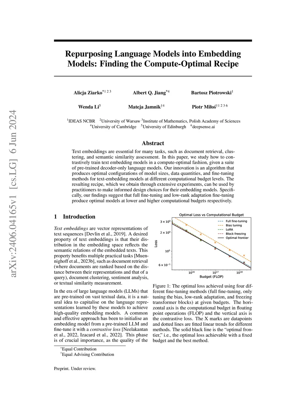 Text embeddings are essential for many tasks, such as document retrieval, clustering, and semantic similarity assessment. In this paper, we study how to contrastively train text embedding models in a compute-optimal fashion, given a suite of pre-trained decoder-only language models. Our innovation is an algorithm that produces optimal configurations of model sizes, data quantities, and fine-tuning methods for text-embedding models at different computational budget levels. The resulting recipe, which we obtain through extensive experiments, can be used by practitioners to make informed design choices for their embedding models. Specifically, our findings suggest that full fine-tuning and low-rank adaptation fine-tuning produce optimal models at lower and higher computational budgets respectively.