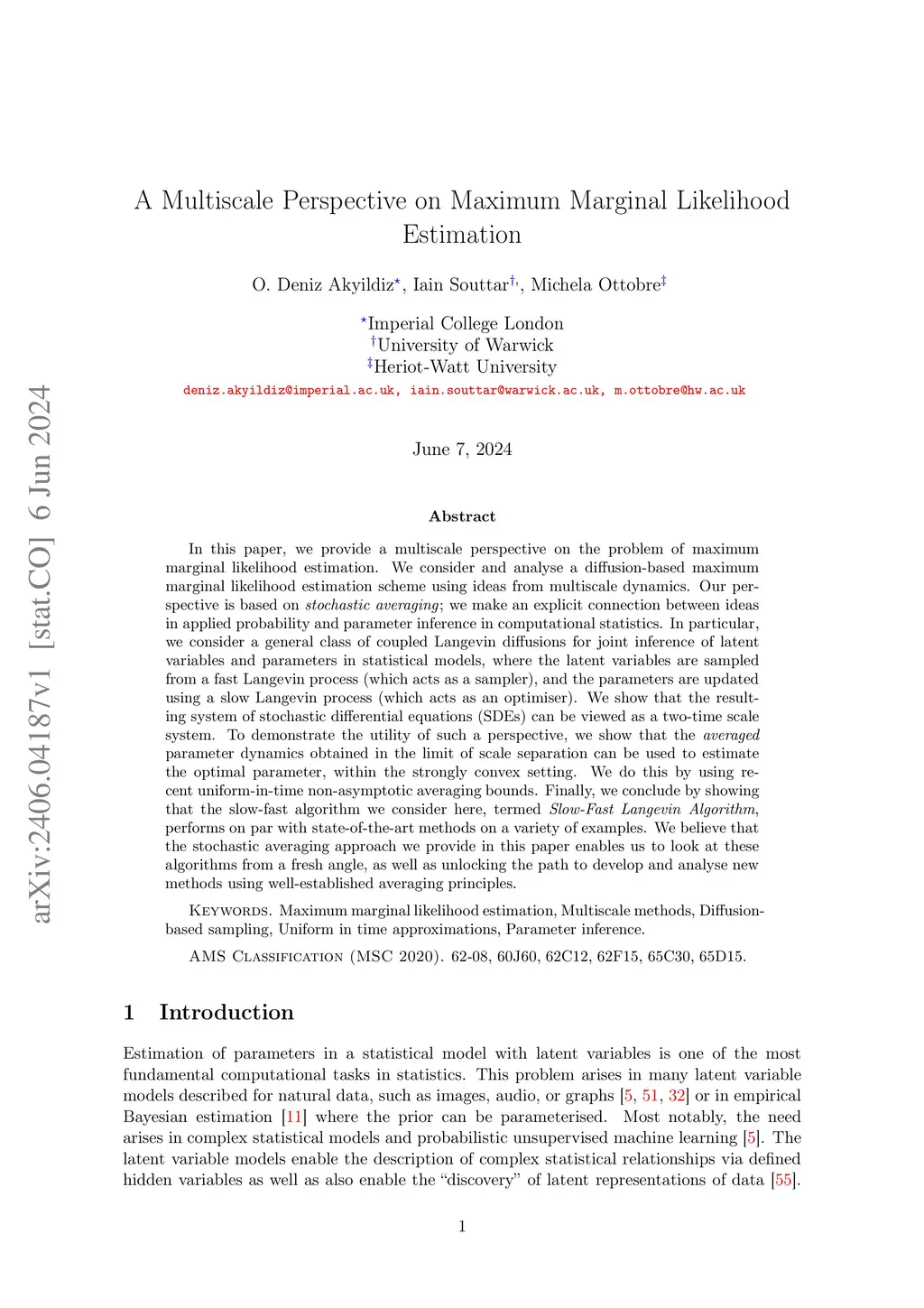 In this paper, we provide a multiscale perspective on the problem of maximum marginal likelihood estimation. We consider and analyse a diffusion-based maximum marginal likelihood estimation scheme using ideas from multiscale dynamics. Our perspective is based on stochastic averaging; we make an explicit connection between ideas in applied probability and parameter inference in computational statistics. In particular, we consider a general class of coupled Langevin diffusions for joint inference of latent variables and parameters in statistical models, where the latent variables are sampled from a fast Langevin process (which acts as a sampler), and the parameters are updated using a slow Langevin process (which acts as an optimiser). We show that the resulting system of stochastic differential equations (SDEs) can be viewed as a two-time scale system. To demonstrate the utility of such a perspective, we show that the averaged parameter dynamics obtained in the limit of scale separation can be used to estimate the optimal parameter, within the strongly convex setting. We do this by using recent uniform-in-time non-asymptotic averaging bounds. Finally, we conclude by showing that the slow-fast algorithm we consider here, termed Slow-Fast Langevin Algorithm, performs on par with state-of-the-art methods on a variety of examples. We believe that the stochastic averaging approach we provide in this paper enables us to look at these algorithms from a fresh angle, as well as unlocking the path to develop and analyse new methods using well-established averaging principles.