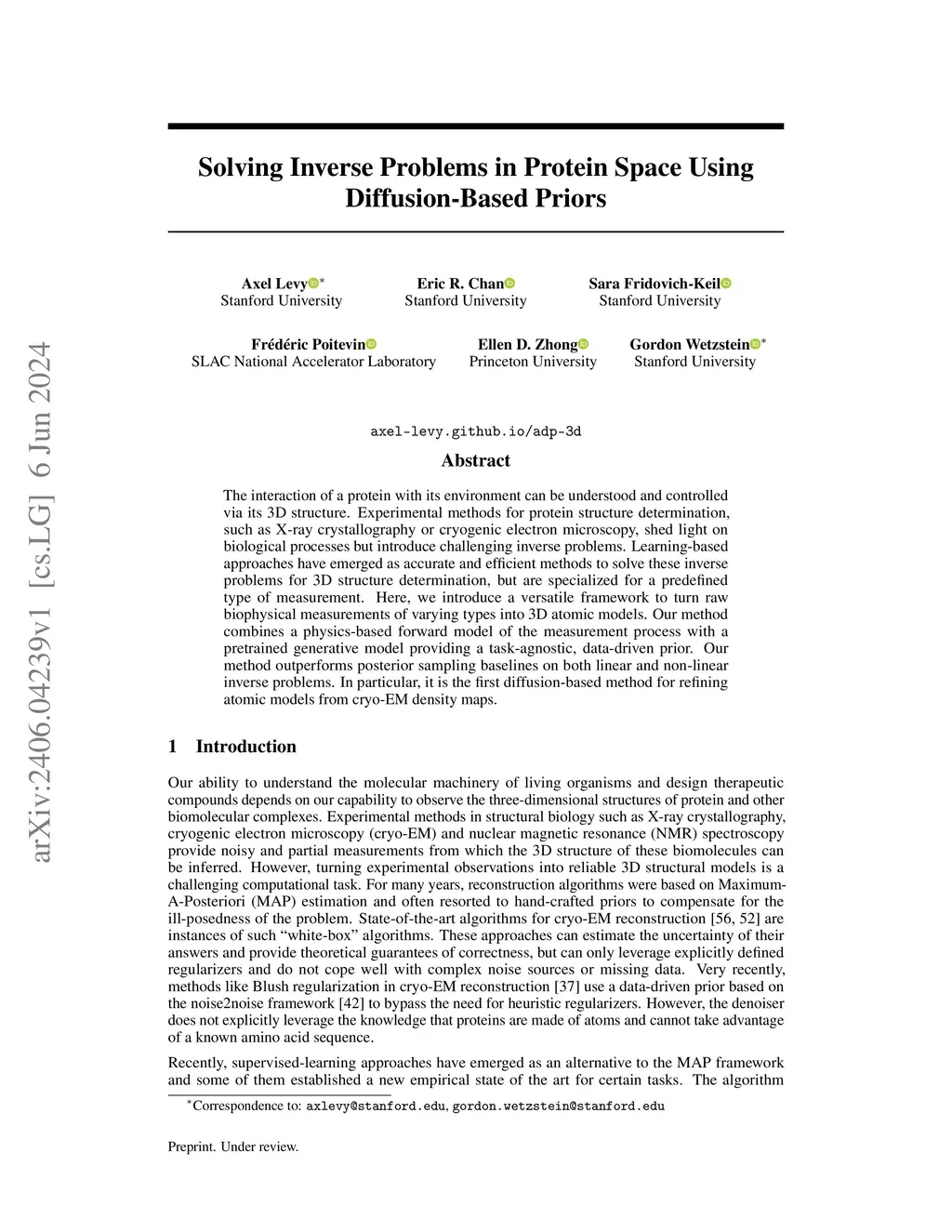 The interaction of a protein with its environment can be understood and controlled via its 3D structure. Experimental methods for protein structure determination, such as X-ray crystallography or cryogenic electron microscopy, shed light on biological processes but introduce challenging inverse problems. Learning-based approaches have emerged as accurate and efficient methods to solve these inverse problems for 3D structure determination, but are specialized for a predefined type of measurement. Here, we introduce a versatile framework to turn biophysical measurements, such as cryo-EM density maps, into 3D atomic models. Our method combines a physics-based forward model of the measurement process with a pretrained generative model providing a task-agnostic, data-driven prior. Our method outperforms posterior sampling baselines on linear and non-linear inverse problems. In particular, it is the first diffusion-based method for refining atomic models from cryo-EM maps and building atomic models from sparse distance matrices.