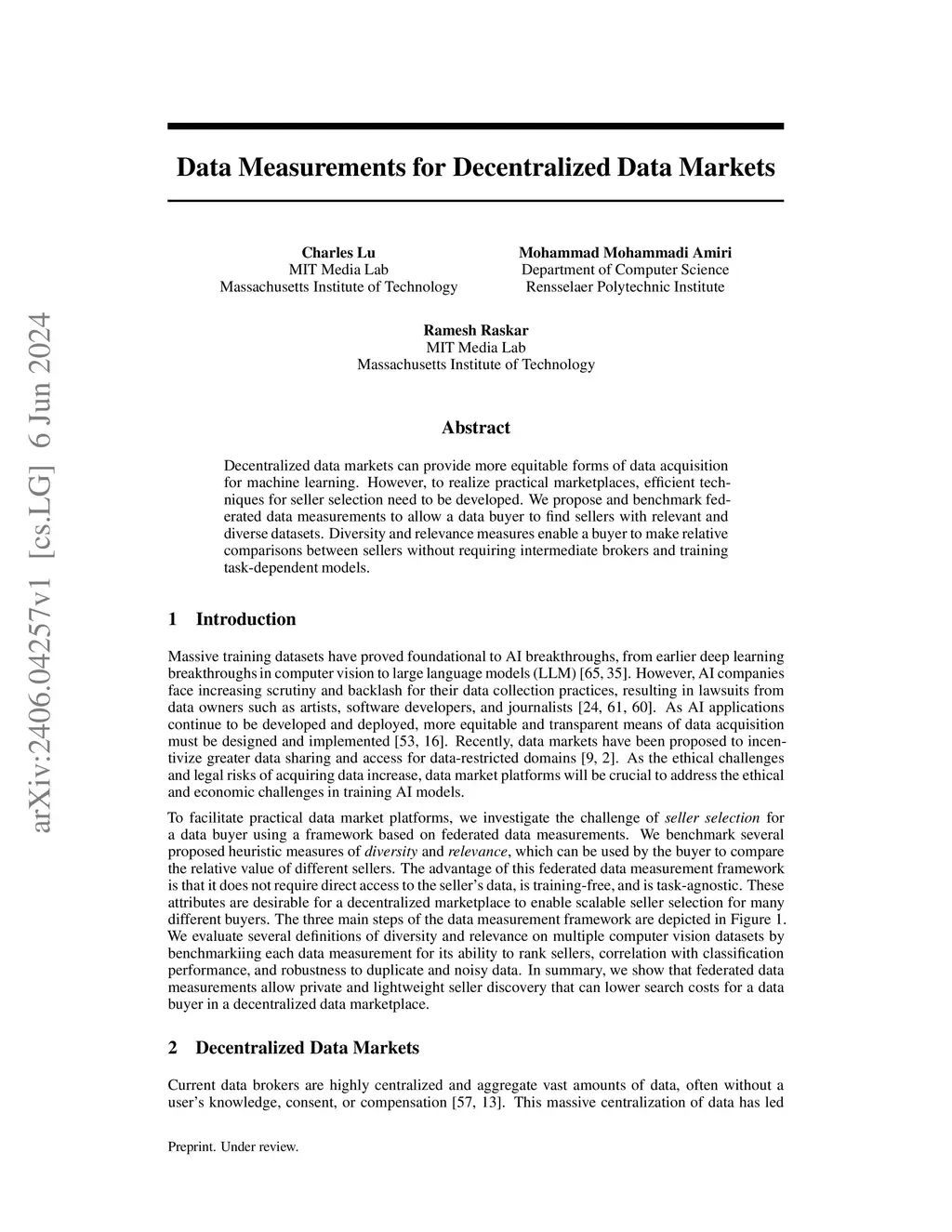 Decentralized data markets can provide more equitable forms of data acquisition for machine learning. However, to realize practical marketplaces, efficient techniques for seller selection need to be developed. We propose and benchmark federated data measurements to allow a data buyer to find sellers with relevant and diverse datasets. Diversity and relevance measures enable a buyer to make relative comparisons between sellers without requiring intermediate brokers and training task-dependent models.