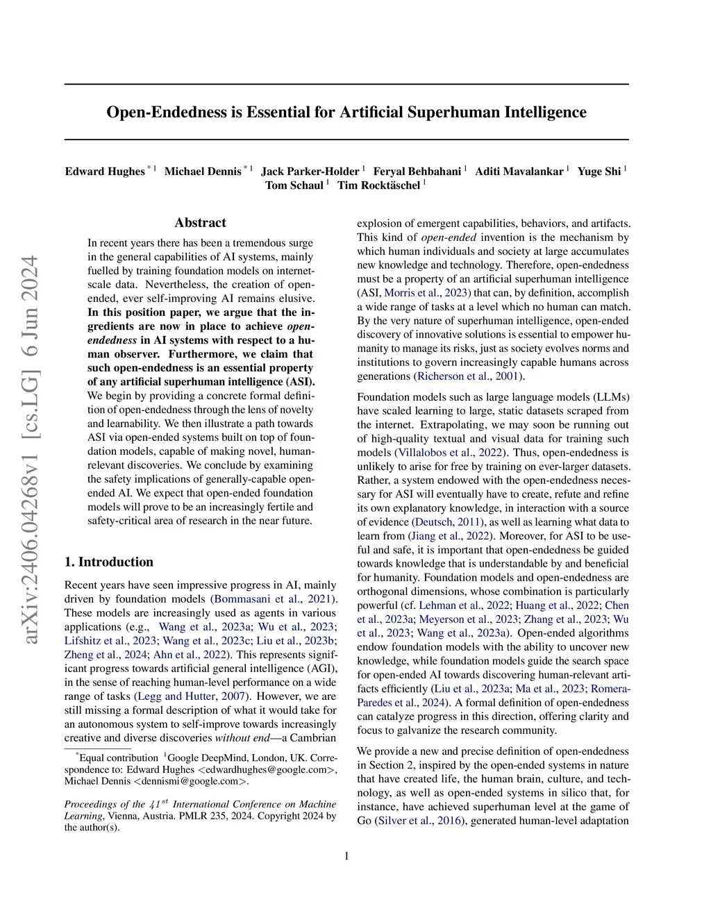 In recent years there has been a tremendous surge in the general capabilities of AI systems, mainly fuelled by training foundation models on internetscale data. Nevertheless, the creation of openended, ever self-improving AI remains elusive. In this position paper, we argue that the ingredients are now in place to achieve openendedness in AI systems with respect to a human observer. Furthermore, we claim that such open-endedness is an essential property of any artificial superhuman intelligence (ASI). We begin by providing a concrete formal definition of open-endedness through the lens of novelty and learnability. We then illustrate a path towards ASI via open-ended systems built on top of foundation models, capable of making novel, humanrelevant discoveries. We conclude by examining the safety implications of generally-capable openended AI. We expect that open-ended foundation models will prove to be an increasingly fertile and safety-critical area of research in the near future.