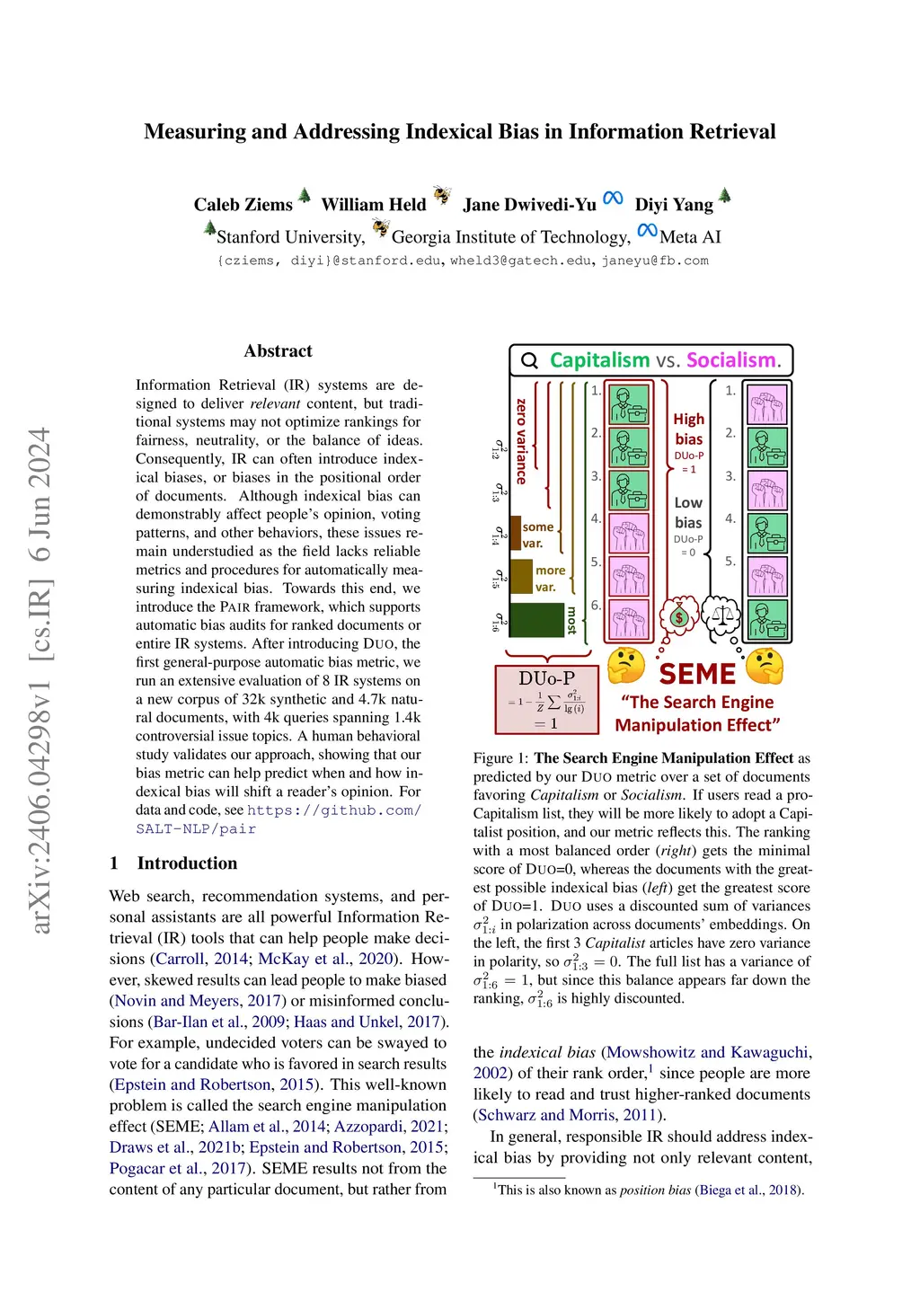Information Retrieval (IR) systems are designed to deliver relevant content, but traditional systems may not optimize rankings for fairness, neutrality, or the balance of ideas. Consequently, IR can often introduce indexical biases, or biases in the positional order of documents. Although indexical bias can demonstrably affect people's opinion, voting patterns, and other behaviors, these issues remain understudied as the field lacks reliable metrics and procedures for automatically measuring indexical bias. Towards this end, we introduce the PAIR framework, which supports automatic bias audits for ranked documents or entire IR systems. After introducing DUO, the first general-purpose automatic bias metric, we run an extensive evaluation of 8 IR systems on a new corpus of 32k synthetic and 4.7k natural documents, with 4k queries spanning 1.4k controversial issue topics. A human behavioral study validates our approach, showing that our bias metric can help predict when and how indexical bias will shift a reader's opinion.