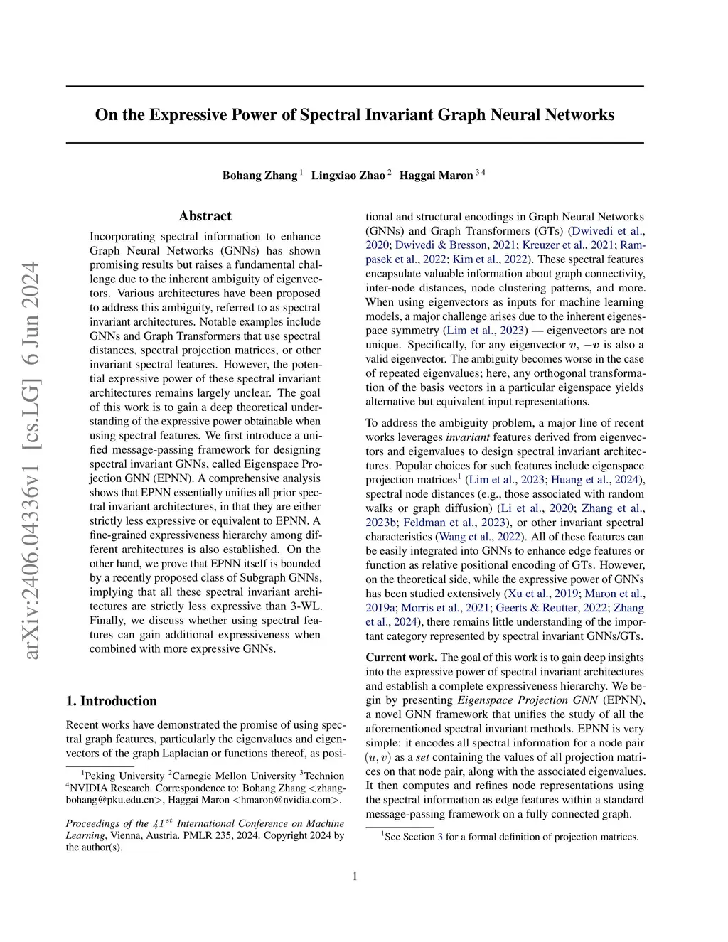 Incorporating spectral information to enhance Graph Neural Networks (GNNs) has shown promising results but raises a fundamental challenge due to the inherent ambiguity of eigenvectors. Various architectures have been proposed to address this ambiguity, referred to as spectral invariant architectures. Notable examples include GNNs and Graph Transformers that use spectral distances, spectral projection matrices, or other invariant spectral features. However, the potential expressive power of these spectral invariant architectures remains largely unclear. The goal of this work is to gain a deep theoretical understanding of the expressive power obtainable when using spectral features. We first introduce a unified message-passing framework for designing spectral invariant GNNs, called Eigenspace Projection GNN (EPNN). A comprehensive analysis shows that EPNN essentially unifies all prior spectral invariant architectures, in that they are either strictly less expressive or equivalent to EPNN. A fine-grained expressiveness hierarchy among different architectures is also established. On the other hand, we prove that EPNN itself is bounded by a recently proposed class of Subgraph GNNs, implying that all these spectral invariant architectures are strictly less expressive than 3-WL. Finally, we discuss whether using spectral features can gain additional expressiveness when combined with more expressive GNNs.