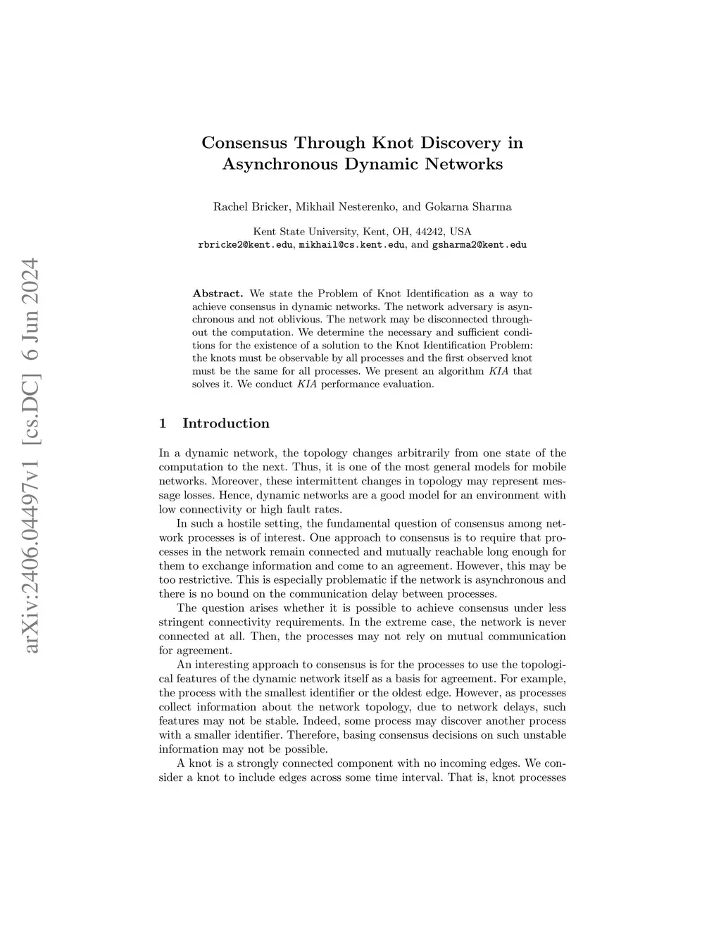 We state the Problem of Knot Identification as a way to achieve consensus in dynamic networks. The network adversary is asynchronous and not oblivious. The network may be disconnected throughout the computation. We determine the necessary and sufficient conditions for the existence of a solution to the Knot Identification Problem: the knots must be observable by all processes and the first observed knot must be the same for all processes. We present an algorithm KIA that solves it. We conduct KIA performance evaluation.