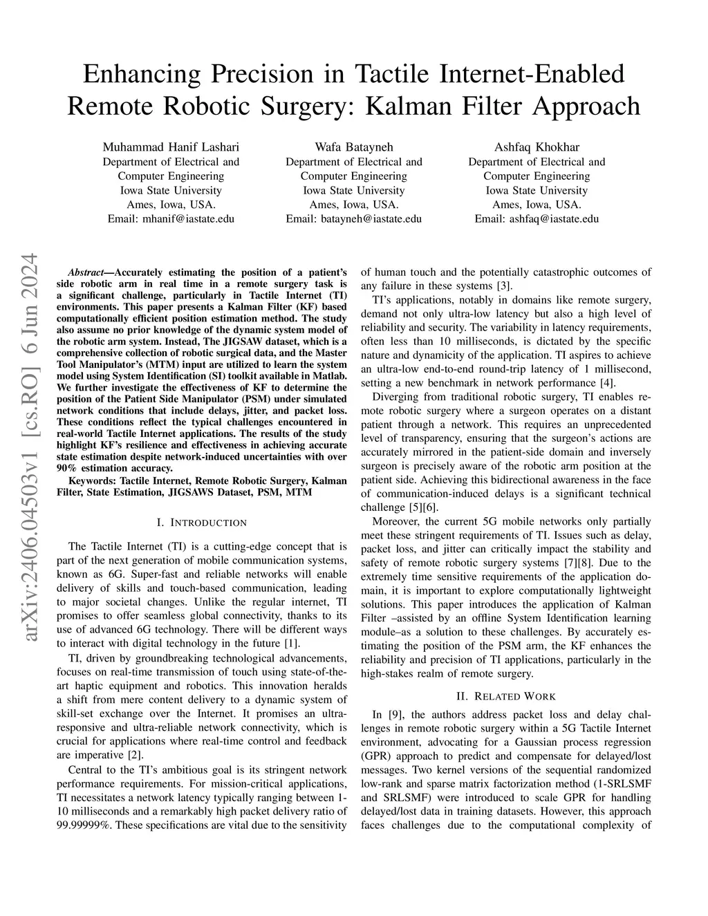 Accurately estimating the position of a patient's side robotic arm in real time in a remote surgery task is a significant challenge, particularly in Tactile Internet (TI) environments. This paper presents a Kalman Filter (KF) based computationally efficient position estimation method. The study also assume no prior knowledge of the dynamic system model of the robotic arm system. Instead, The JIGSAW dataset, which is a comprehensive collection of robotic surgical data, and the Master Tool Manipulator's (MTM) input are utilized to learn the system model using System Identification (SI) toolkit available in Matlab. We further investigate the effectiveness of KF to determine the position of the Patient Side Manipulator (PSM) under simulated network conditions that include delays, jitter, and packet loss. These conditions reflect the typical challenges encountered in real-world Tactile Internet applications. The results of the study highlight KF's resilience and effectiveness in achieving accurate state estimation despite network-induced uncertainties with over 90\% estimation accuracy.
