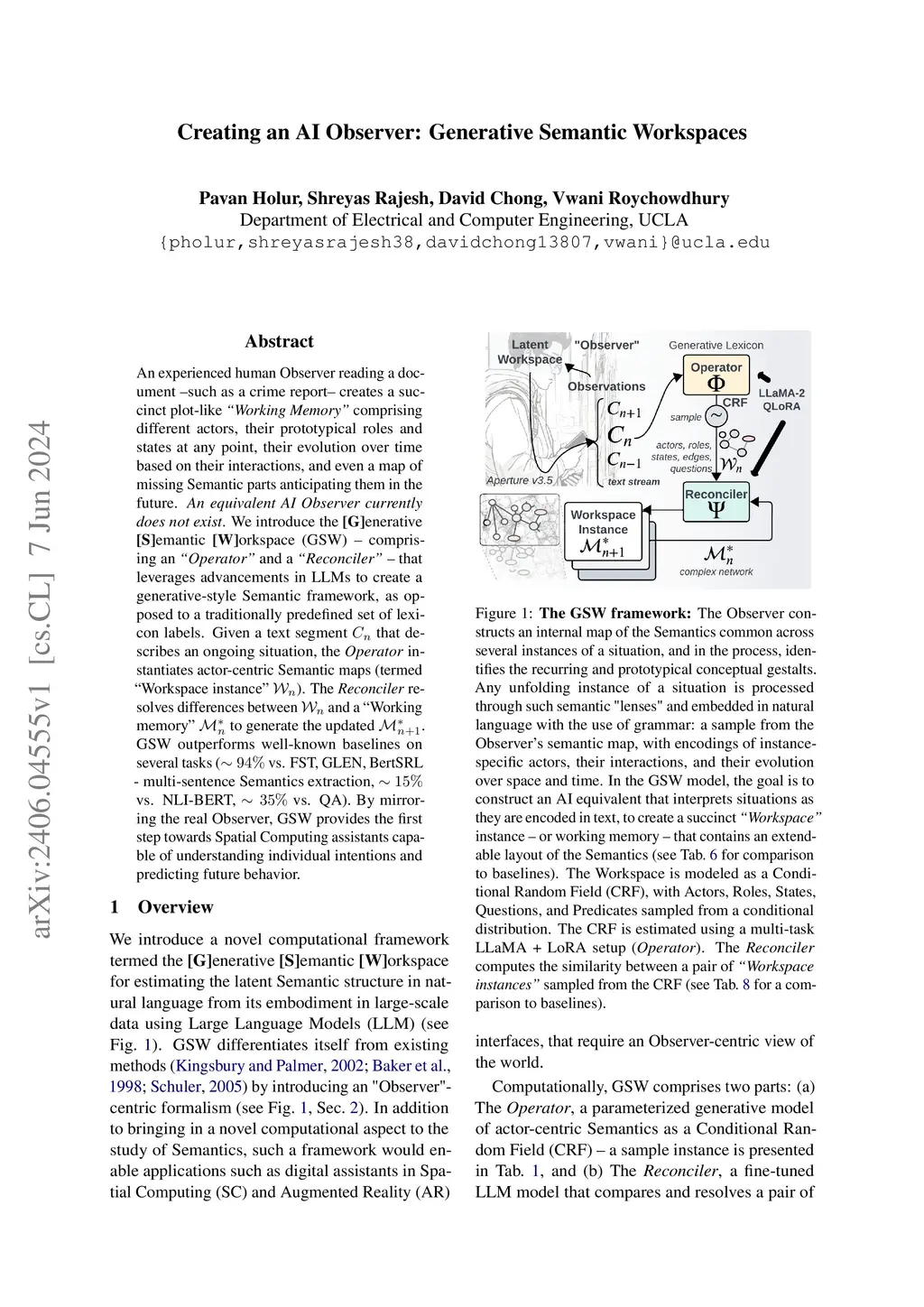 An experienced human Observer reading a document -- such as a crime report -- creates a succinct plot-like comprising different actors, their prototypical roles and states at any point, their evolution over time based on their interactions, and even a map of missing Semantic parts anticipating them in the future. . We introduce the enerative emantic orkspace (GSW) -- comprising an and a -- that leverages advancements in LLMs to create a generative-style Semantic framework, as opposed to a traditionally predefined set of lexicon labels. Given a text segment that describes an ongoing situation, the instantiates actor-centric Semantic maps (termed ``Workspace instance'' ). The resolves differences between and a ``Working memory'' to generate the updated . GSW outperforms well-known baselines on several tasks ( vs. FST, GLEN, BertSRL - multi-sentence Semantics extraction, vs. NLI-BERT, vs. QA). By mirroring the real Observer, GSW provides the first step towards Spatial Computing assistants capable of understanding individual intentions and predicting future behavior.