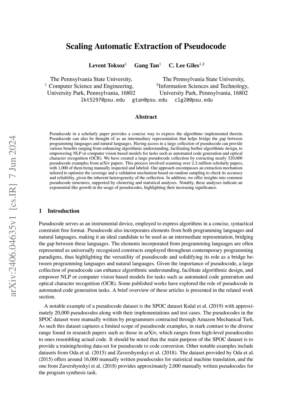 Pseudocode in a scholarly paper provides a concise way to express the algorithms implemented therein. Pseudocode can also be thought of as an intermediary representation that helps bridge the gap between programming languages and natural languages. Having access to a large collection of pseudocode can provide various benefits ranging from enhancing algorithmic understanding, facilitating further algorithmic design, to empowering NLP or computer vision based models for tasks such as automated code generation and optical character recognition (OCR). We have created a large pseudocode collection by extracting nearly 320,000 pseudocode examples from arXiv papers. This process involved scanning over million scholarly papers, with 1,000 of them being manually inspected and labeled. Our approach encompasses an extraction mechanism tailored to optimize the coverage and a validation mechanism based on random sampling to check its accuracy and reliability, given the inherent heterogeneity of the collection. In addition, we offer insights into common pseudocode structures, supported by clustering and statistical analyses. Notably, these analyses indicate an exponential-like growth in the usage of pseudocodes, highlighting their increasing significance.