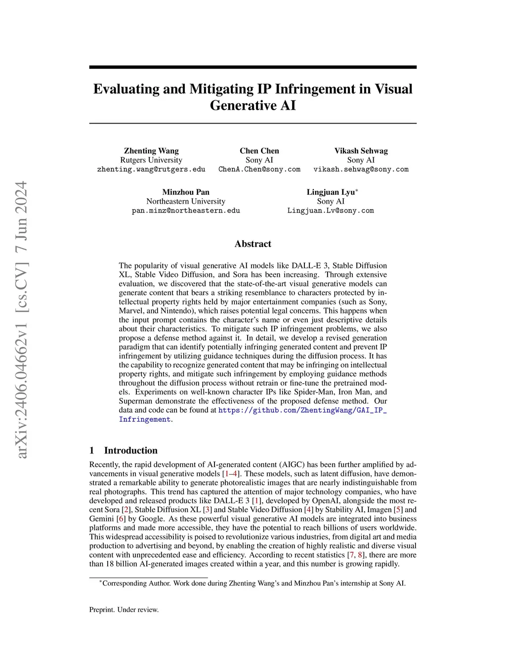 The popularity of visual generative AI models like DALL-E 3, Stable Diffusion XL, Stable Video Diffusion, and Sora has been increasing. Through extensive evaluation, we discovered that the state-of-the-art visual generative models can generate content that bears a striking resemblance to characters protected by intellectual property rights held by major entertainment companies (such as Sony, Marvel, and Nintendo), which raises potential legal concerns. This happens when the input prompt contains the character's name or even just descriptive details about their characteristics. To mitigate such IP infringement problems, we also propose a defense method against it. In detail, we develop a revised generation paradigm that can identify potentially infringing generated content and prevent IP infringement by utilizing guidance techniques during the diffusion process. It has the capability to recognize generated content that may be infringing on intellectual property rights, and mitigate such infringement by employing guidance methods throughout the diffusion process without retrain or fine-tune the pretrained models. Experiments on well-known character IPs like Spider-Man, Iron Man, and Superman demonstrate the effectiveness of the proposed defense method. Our data and code can be found at https://github.com/ZhentingWang/GAI_IP_Infringement.