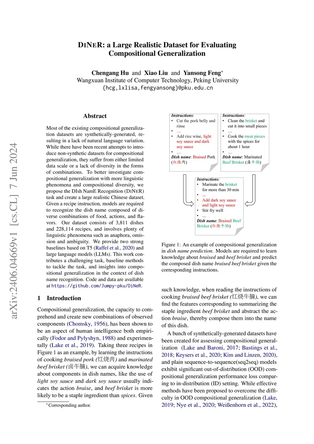 Most of the existing compositional generalization datasets are synthetically-generated, resulting in a lack of natural language variation. While there have been recent attempts to introduce non-synthetic datasets for compositional generalization, they suffer from either limited data scale or a lack of diversity in the forms of combinations. To better investigate compositional generalization with more linguistic phenomena and compositional diversity, we propose the DIsh NamE Recognition (DiNeR) task and create a large realistic Chinese dataset. Given a recipe instruction, models are required to recognize the dish name composed of diverse combinations of food, actions, and flavors. Our dataset consists of 3,811 dishes and 228,114 recipes, and involves plenty of linguistic phenomena such as anaphora, omission and ambiguity. We provide two strong baselines based on T5 and large language models (LLMs). This work contributes a challenging task, baseline methods to tackle the task, and insights into compositional generalization in the context of dish name recognition. Code and data are available at https://github.com/Jumpy-pku/DiNeR.