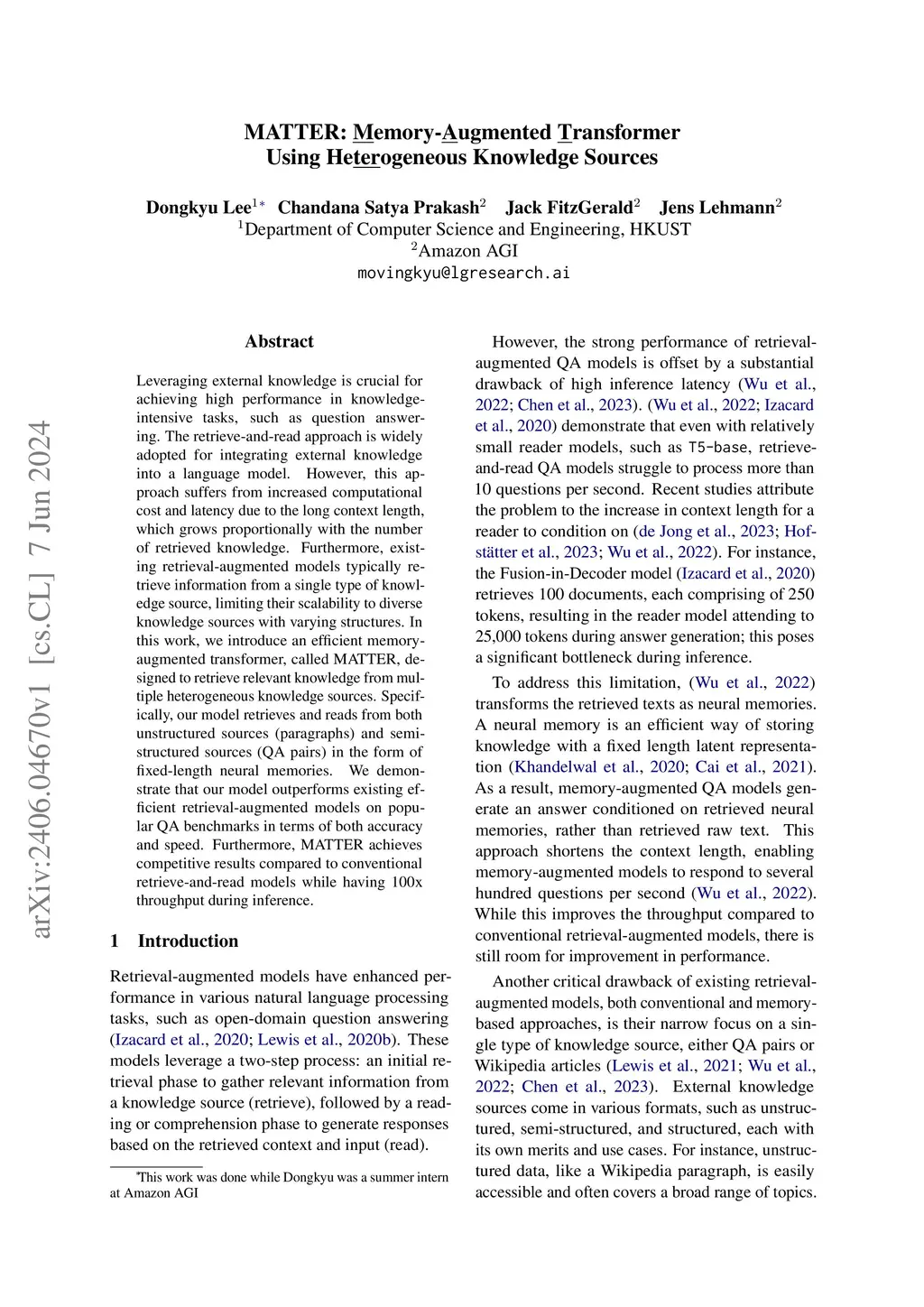 MATTER: Memory-Augmented Transformer Using Heterogeneous Knowledge