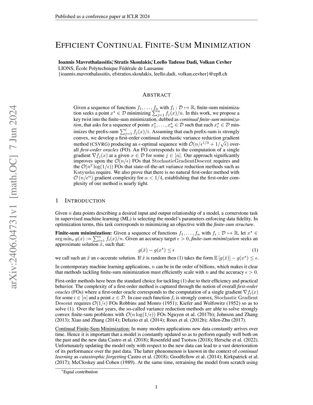 Given a sequence of functions with , finite-sum minimization seeks a point minimizing . In this work, we propose a key twist into the finite-sum minimization, dubbed as continual finite-sum minimization, that asks for a sequence of points such that each minimizes the prefix-sum . Assuming that each prefix-sum is strongly convex, we develop a first-order continual stochastic variance reduction gradient method () producing an -optimal sequence with overall first-order oracles (FO). An FO corresponds to the computation of a single gradient at a given for some . Our approach significantly improves upon the FOs that requires and the FOs that state-of-the-art variance reduction methods such as require. We also prove that there is no natural first-order method with gradient complexity for , establishing that the first-order complexity of our method is nearly tight.