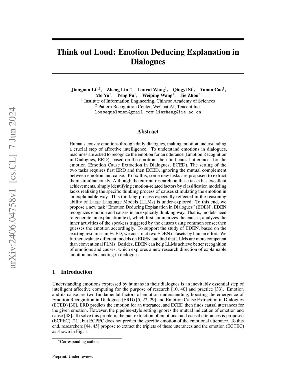 Humans convey emotions through daily dialogues, making emotion understanding a crucial step of affective intelligence. To understand emotions in dialogues, machines are asked to recognize the emotion for an utterance (Emotion Recognition in Dialogues, ERD); based on the emotion, then find causal utterances for the emotion (Emotion Cause Extraction in Dialogues, ECED). The setting of the two tasks requires first ERD and then ECED, ignoring the mutual complement between emotion and cause. To fix this, some new tasks are proposed to extract them simultaneously. Although the current research on these tasks has excellent achievements, simply identifying emotion-related factors by classification modeling lacks realizing the specific thinking process of causes stimulating the emotion in an explainable way. This thinking process especially reflected in the reasoning ability of Large Language Models (LLMs) is under-explored. To this end, we propose a new task "Emotion Deducing Explanation in Dialogues" (EDEN). EDEN recognizes emotion and causes in an explicitly thinking way. That is, models need to generate an explanation text, which first summarizes the causes; analyzes the inner activities of the speakers triggered by the causes using common sense; then guesses the emotion accordingly. To support the study of EDEN, based on the existing resources in ECED, we construct two EDEN datasets by human effort. We further evaluate different models on EDEN and find that LLMs are more competent than conventional PLMs. Besides, EDEN can help LLMs achieve better recognition of emotions and causes, which explores a new research direction of explainable emotion understanding in dialogues.