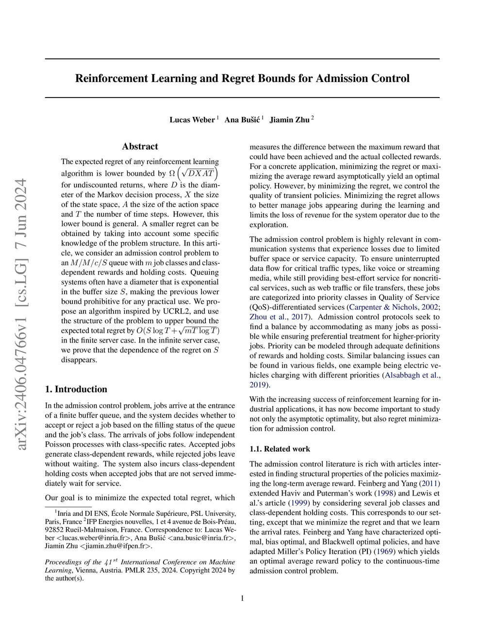 The expected regret of any reinforcement learning algorithm is lower bounded by for undiscounted returns, where is the diameter of the Markov decision process, the size of the state space, the size of the action space and the number of time steps. However, this lower bound is general. A smaller regret can be obtained by taking into account some specific knowledge of the problem structure. In this article, we consider an admission control problem to an queue with job classes and class-dependent rewards and holding costs. Queuing systems often have a diameter that is exponential in the buffer size , making the previous lower bound prohibitive for any practical use. We propose an algorithm inspired by UCRL2, and use the structure of the problem to upper bound the expected total regret by in the finite server case. In the infinite server case, we prove that the dependence of the regret on disappears.