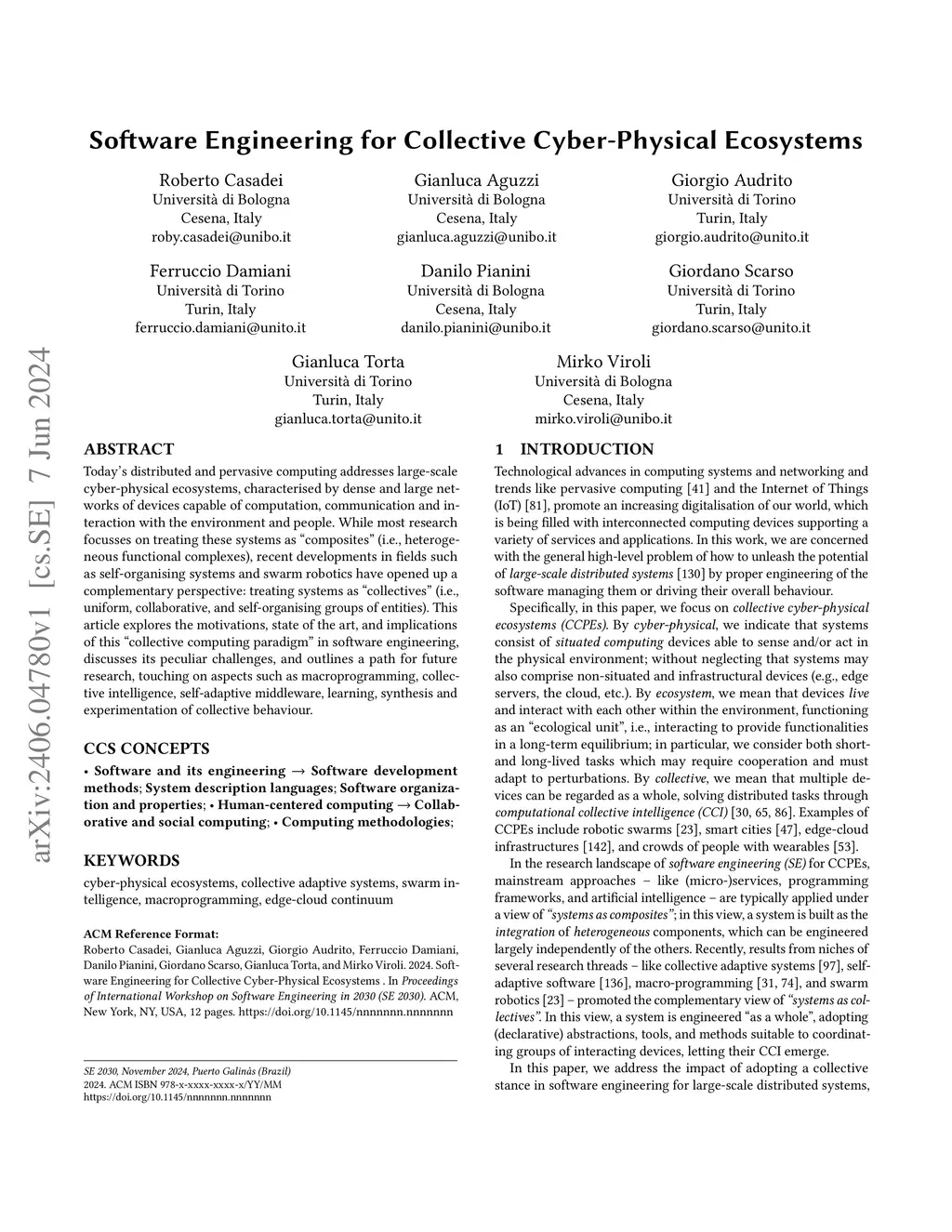 Today's distributed and pervasive computing addresses large-scale cyber-physical ecosystems, characterised by dense and large networks of devices capable of computation, communication and interaction with the environment and people. While most research focusses on treating these systems as "composites" (i.e., heterogeneous functional complexes), recent developments in fields such as self-organising systems and swarm robotics have opened up a complementary perspective: treating systems as "collectives" (i.e., uniform, collaborative, and self-organising groups of entities). This article explores the motivations, state of the art, and implications of this "collective computing paradigm" in software engineering, discusses its peculiar challenges, and outlines a path for future research, touching on aspects such as macroprogramming, collective intelligence, self-adaptive middleware, learning, synthesis, and experimentation of collective behaviour.