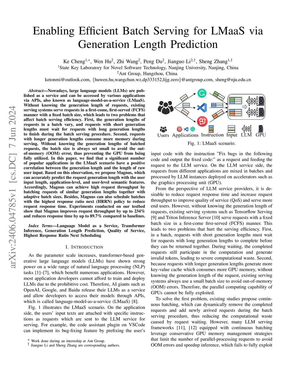 Nowadays, large language models (LLMs) are published as a service and can be accessed by various applications via APIs, also known as language-model-as-a-service (LMaaS). Without knowing the generation length of requests, existing serving systems serve requests in a first-come, first-served (FCFS) manner with a fixed batch size, which leads to two problems that affect batch serving efficiency. First, the generation lengths of requests in a batch vary, and requests with short generation lengths must wait for requests with long generation lengths to finish during the batch serving procedure. Second, requests with longer generation lengths consume more memory during serving. Without knowing the generation lengths of batched requests, the batch size is always set small to avoid the out-of-memory (OOM) error, thus preventing the GPU from being fully utilized. In this paper, we find that a significant number of popular applications in the LMaaS scenario have a positive correlation between the generation length and the length of raw user input. Based on this observation, we propose Magnus, which can accurately predict the request generation length with the user input length, application-level, and user-level semantic features. Accordingly, Magnus can achieve high request throughput by batching requests of similar generation lengths together with adaptive batch sizes. Besides, Magnus can also schedule batches with the highest response ratio next (HRRN) policy to reduce request response time. Experiments conducted on our testbed show that Magnus improves request throughput by up to 234\% and reduces response time by up to 89.7\% compared to baselines.